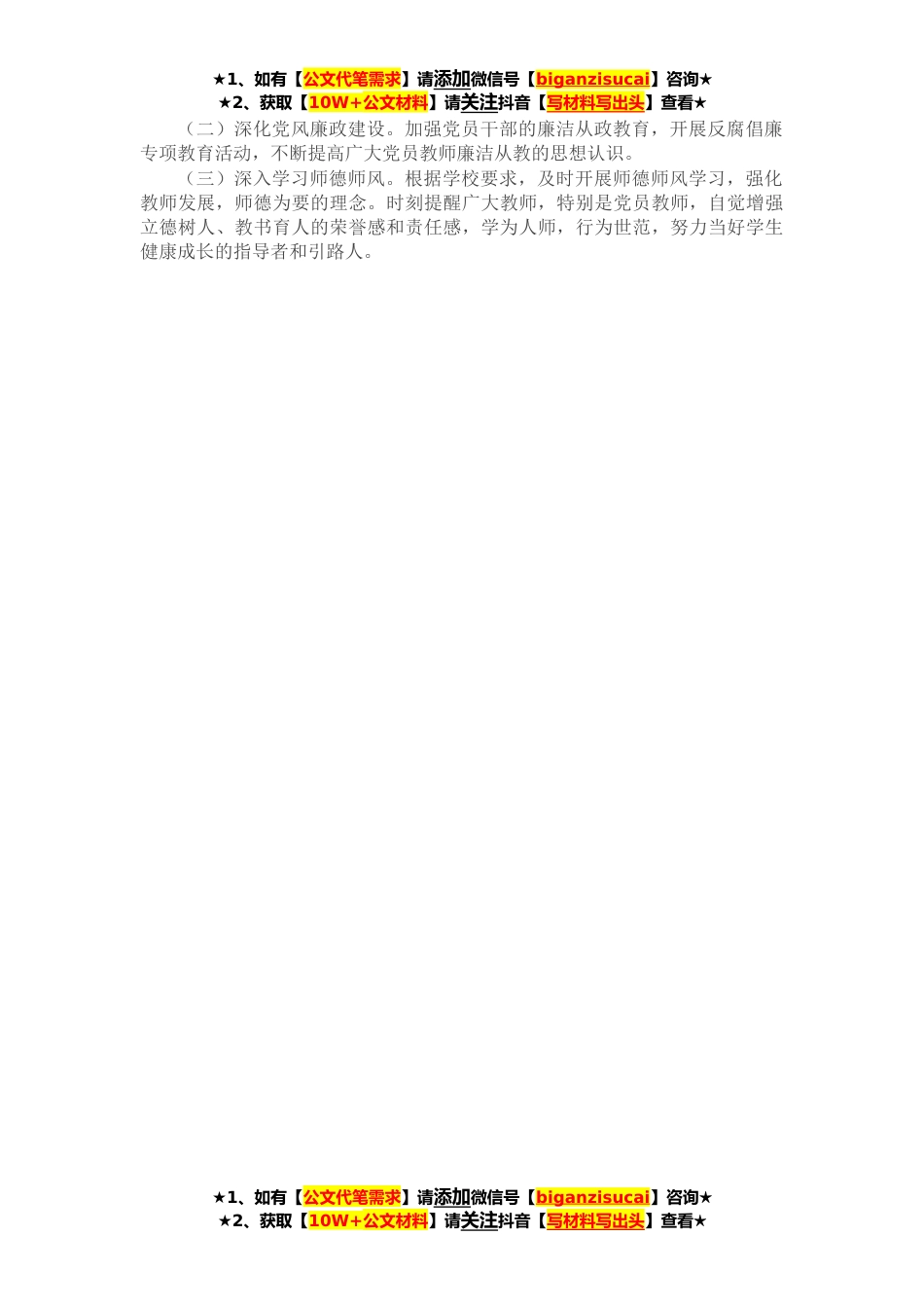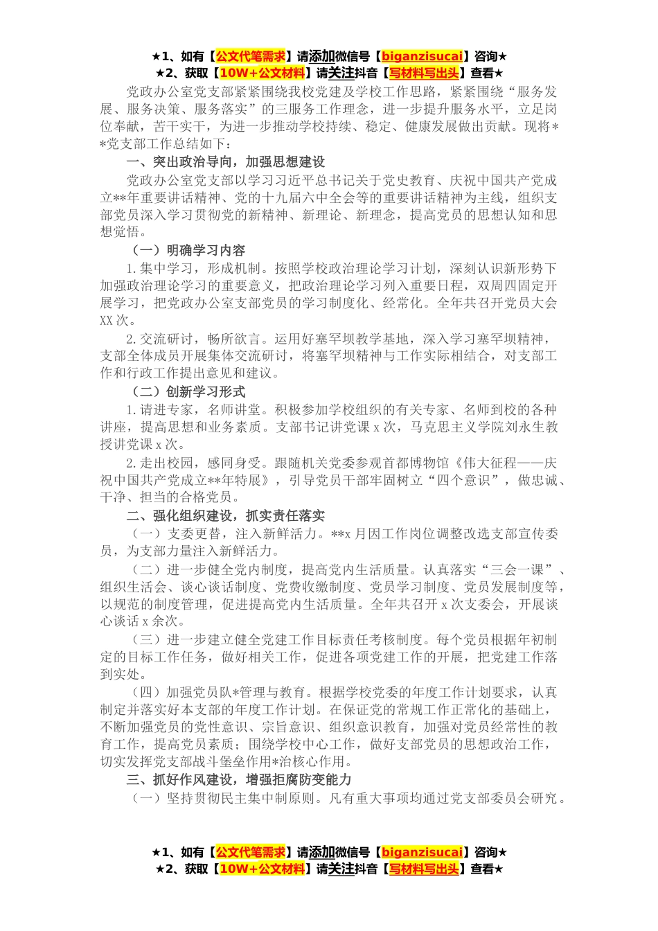 ★1、如有【公文代笔需求】请添加微信号【biganzisucai】咨询★★2、获取【10W+公文材料】请关注抖音【写材料写出头】查看★党政办公室党支部紧紧围绕我校党建及学校工作思路,紧紧围绕“服务发展、服务决策、服务落实”的三服务工作理念,进一步提升服务水平,立足岗位奉献,苦干实干,为进一步推动学校持续、稳定、健康发展做出贡献。现将**党支部工作总结如下:一、突出政治导向,加强思想建设党政办公室党支部以学习习近平总书记关于党史教育、庆祝中国共产党成立**年重要讲话精神、党的十九届六中全会等的重要讲话精神为主线,组织支部党员深入学习贯彻党的新精神、新理论、新理念,提高党员的思想认知和思想觉悟。(一)明确学习内容1.集中学习,形成机制。按照学校政治理论学习计划,深刻认识新形势下加强...