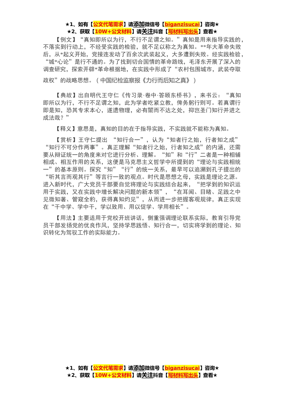 ★1、如有【公文代笔需求】请添加微信号【biganzisucai】咨询★★2、获取【10W+公文材料】请关注抖音【写材料写出头】查看★【例文】“真知即所以为行,不行不足谓之知。”真知是用来指导实践的,不落实到行动上,不经受实践的检验,就不足以称之为真知。**年大革命失败后,从*起义开始,党接连发动了百余次武装起义,大多遭到失败。经实践检验,“城*心论”是行不通的。为了找到切合国情的革命路线,毛泽东开展了深入的调查研究,探索开辟*革命根据地,在实践中形成了“农村包围城市,武装夺取政权”的战略思想。(中国纪检监察报《力行而后知之真》)【典故】出自明代王守仁《传习录·卷中·答顾东桥书》,来书云:“真知即所以为行,不行不足谓之知,此为学者吃紧立教,俾务躬行则可。若真谓行即是知,恐其专求...