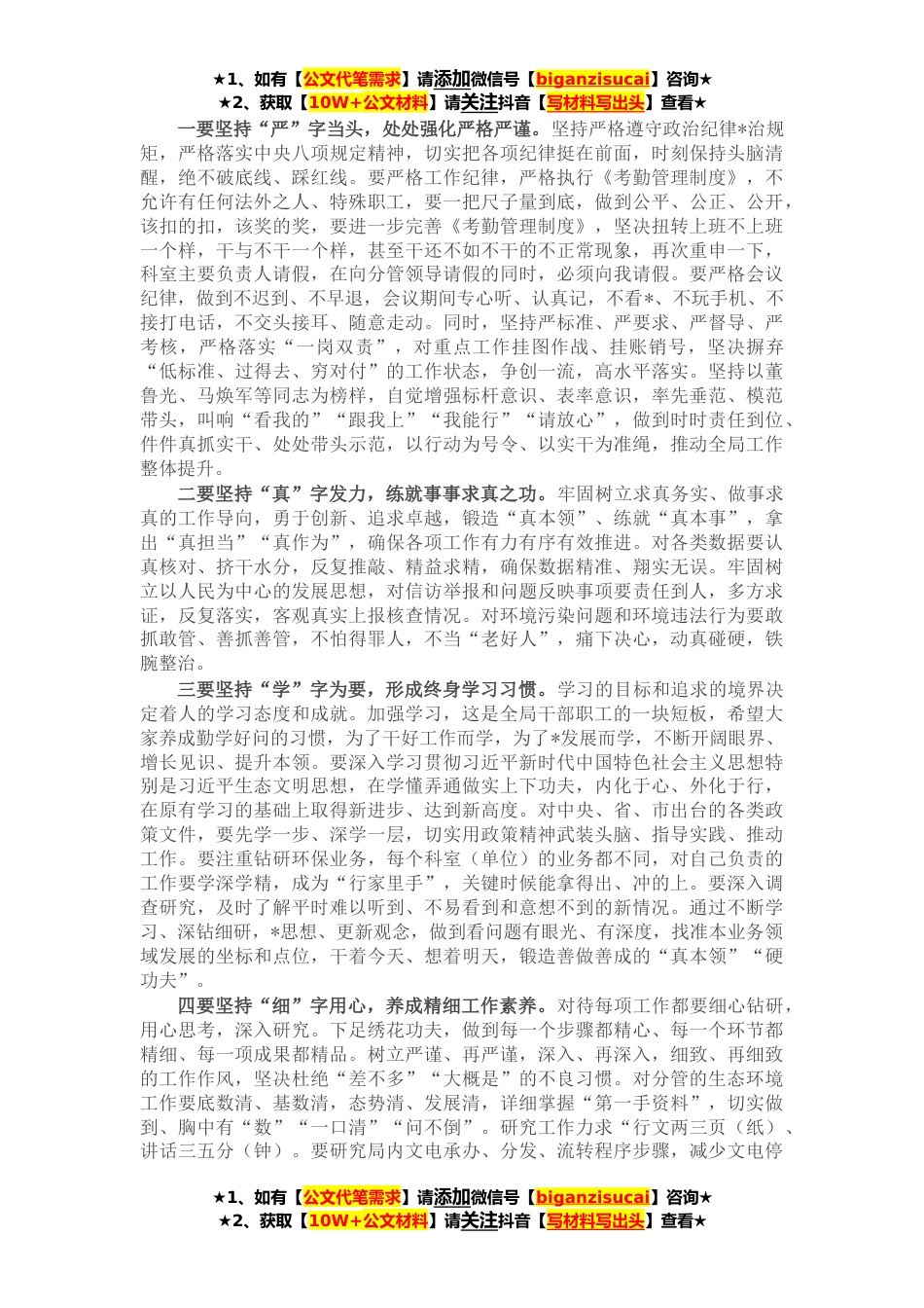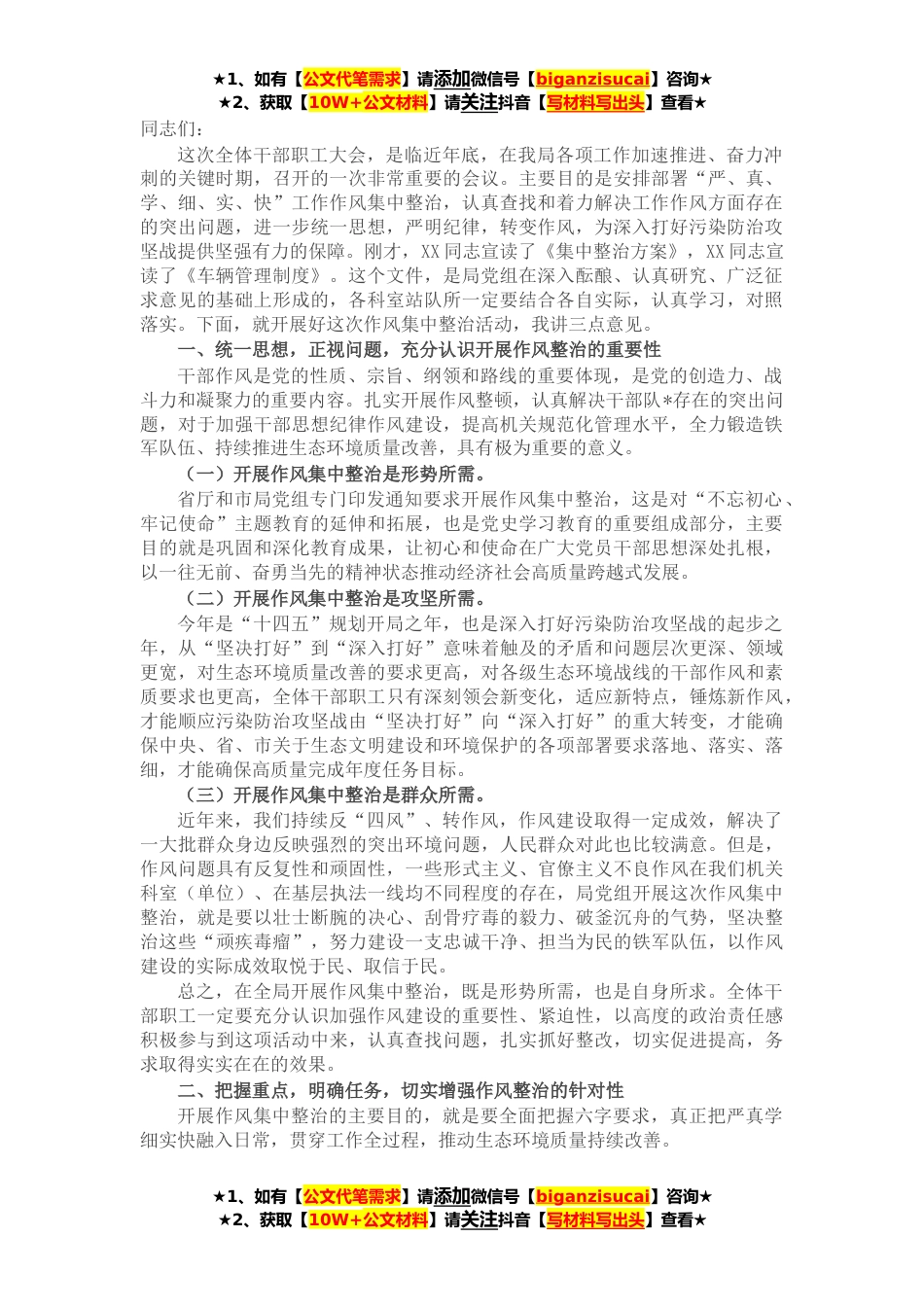 ★1、如有【公文代笔需求】请添加微信号【biganzisucai】咨询★★2、获取【10W+公文材料】请关注抖音【写材料写出头】查看★同志们:这次全体干部职工大会,是临近年底,在我局各项工作加速推进、奋力冲刺的关键时期,召开的一次非常重要的会议。主要目的是安排部署“严、真、学、细、实、快”工作作风集中整治,认真查找和着力解决工作作风方面存在的突出问题,进一步统一思想,严明纪律,转变作风,为深入打好污染防治攻坚战提供坚强有力的保障。刚才,XX同志宣读了《集中整治方案》,XX同志宣读了《车辆管理制度》。这个文件,是局党组在深入酝酿、认真研究、广泛征求意见的基础上形成的,各科室站队所一定要结合各自实际,认真学习,对照落实。下面,就开展好这次作风集中整治活动,我讲三点意见。一、统一思...