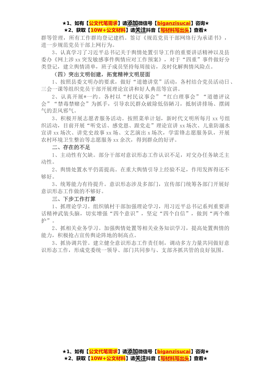 ★1、如有【公文代笔需求】请添加微信号【biganzisucai】咨询★★2、获取【10W+公文材料】请关注抖音【写材料写出头】查看★今年以来,在县委宣传部和镇党委的正确领导下,xx镇坚持以习近平新时代中国特色社会主义思想为指导,深入学习习近平系列重要讲话精神,党的十九届六中全会精神,紧紧围绕省市县精神文明建设会议精神和全镇中心工作,真抓实干,务求实效,较好的完成了上级交办的工作任务,现将主要工作总结如下:一、开展工作情况(一)突出理论学习,推进学习型党组织建设1、积极做好党委中心组学习。年初,镇党委研究制订了《xx镇**党委中心组理论学习计划》,坚持每月至少开展x次党委理论中心组学习,每周开展x次支部集体学习例会。目前开展理论学习中心组专题学习xx次,支部学习例会xx次,带头*课x次,...