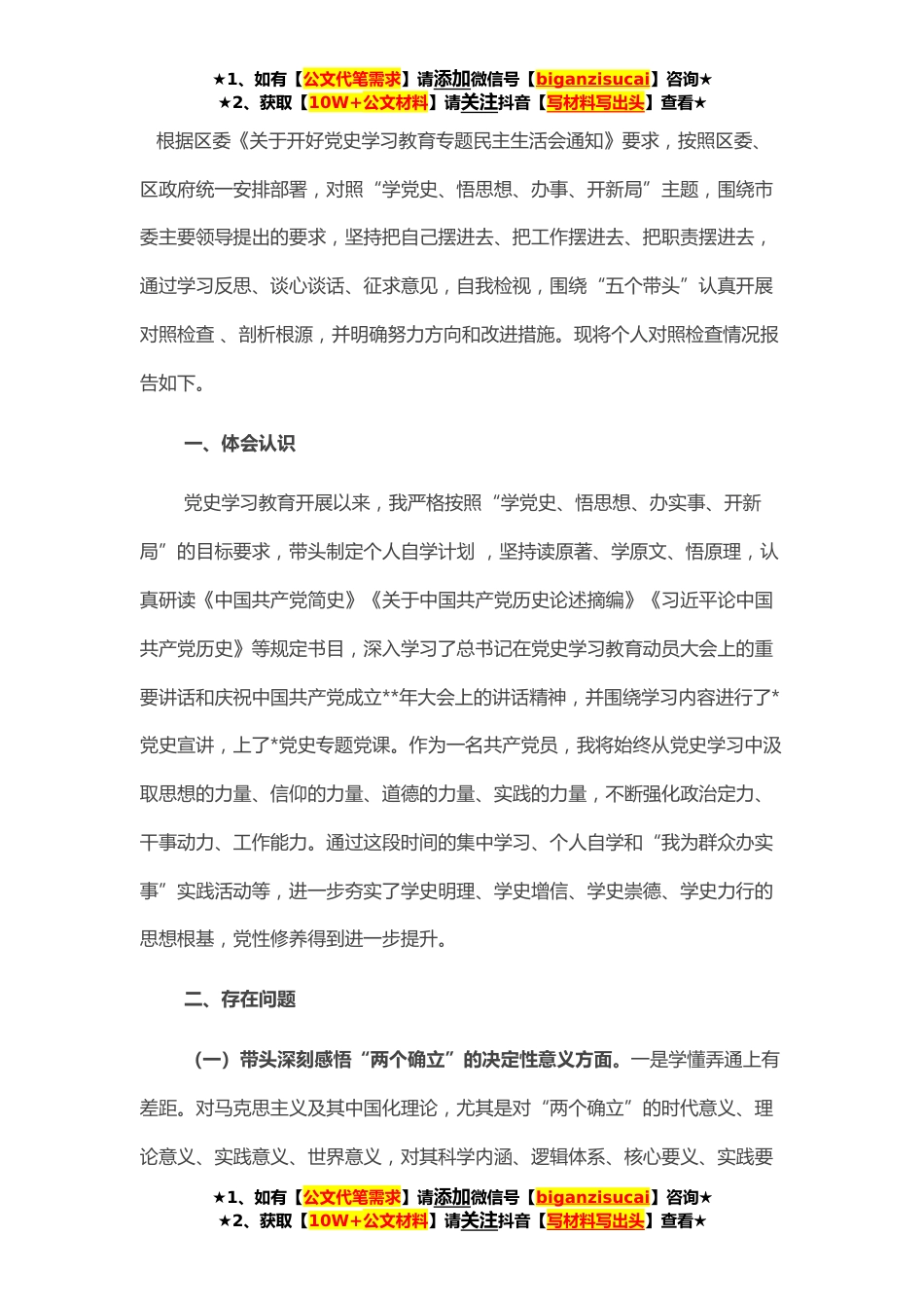 ★1、如有【公文代笔需求】请添加微信号【biganzisucai】咨询★★2、获取【10W+公文材料】请关注抖音【写材料写出头】查看★根据区委《关于开好党史学习教育专题民主生活会通知》要求,按照区委、区政府统一安排部署,对照“学党史、悟思想、办事、开新局”主题,围绕市委主要领导提出的要求,坚持把自己摆进去、把工作摆进去、把职责摆进去,通过学习反思、谈心谈话、征求意见,自我检视,围绕“五个带头”认真开展对照检查、剖析根源,并明确努力方向和改进措施。现将个人对照检查情况报告如下。一、体会认识党史学习教育开展以来,我严格按照“学党史、悟思想、办实事、开新局”的目标要求,带头制定个人自学计划,坚持读原著、学原文、悟原理,认真研读《中国共产党简史》《关于中国共产党历史论述摘编》《习...