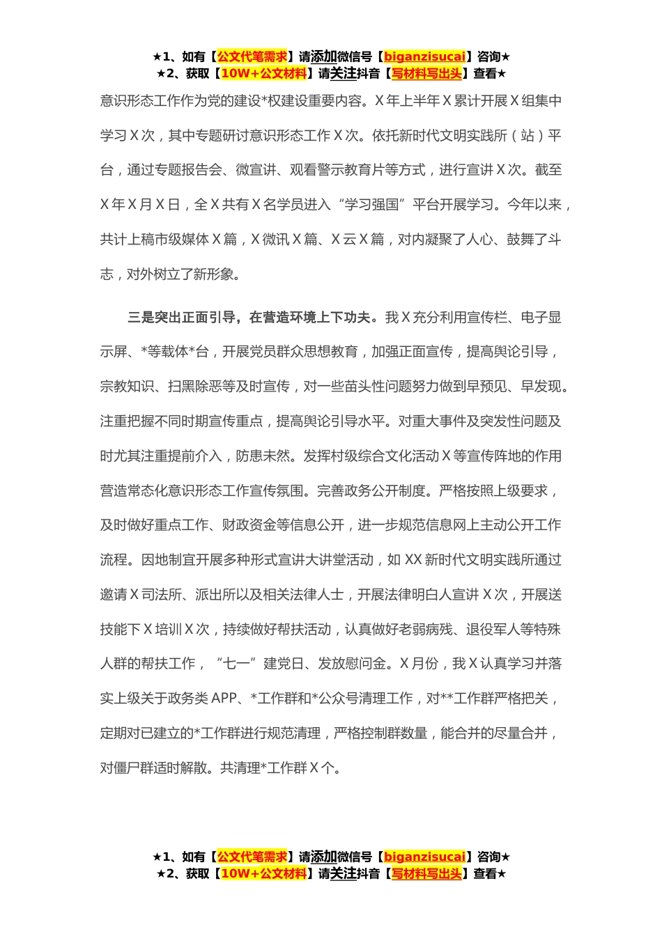 ★1、如有【公文代笔需求】请添加微信号【biganzisucai】咨询★★2、获取【10W+公文材料】请关注抖音【写材料写出头】查看★同志们:今天召开这次会议,主要任务是:深入贯彻落实中央和省、市委关于意识形态工作的决策部署,分析当前意识形态工作中存在的问题和不足,推动意识形态工作责任制落实,强化意识形态工作的领导权和主动权,切实维护好、巩固好X意识形态领域的安全稳定。今年以来,X意识形态领域形势总体平稳可控,正面舆论引导、网络舆情管控等工作任务得到了有效落实,特别是X开展了“正风肃纪转作风、提升能力促发展”和干部纪律作风集中整顿活动,广大干部职工进一步统一了思想、转变了作风、提升了能力,干事创业的热情也更加高涨。近期,我们又开展了“模范机关、身边榜样”征文演讲比赛,组织优秀...