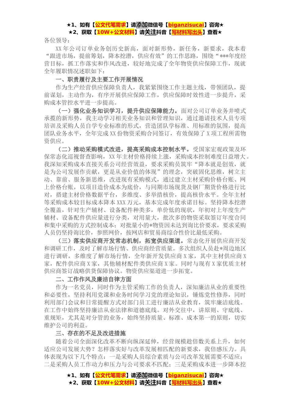 ★1、如有【公文代笔需求】请添加微信号【biganzisucai】咨询★★2、获取【10W+公文材料】请关注抖音【写材料写出头】查看★各位领导:XX年公司订单业务创历史新高,面对新形势,新任务,新要求,我本着“跟进市场,提前筹划,降本挖潜,供应有效”的工作思路,围绕“***年度经营目标,抓工作落实和作风改进,较好地完成了全年物资供应保障工作,现就全年履职情况述职如下:一、职责履行及主要工作开展情况作为生产经营供应保障负责人,我紧紧围绕工作主题主线,带领团队,提前谋划,主动作为,有序开展供应保障工作,供应保障时效性进一步提升,采购成本管控水平进一步提高。(一)强化业务知识学习,提升供应保障能力。面对公司订单业务井喷式承揽的新形势,我主动学习相关业务知识和管理知识,通过邀请技术人员...