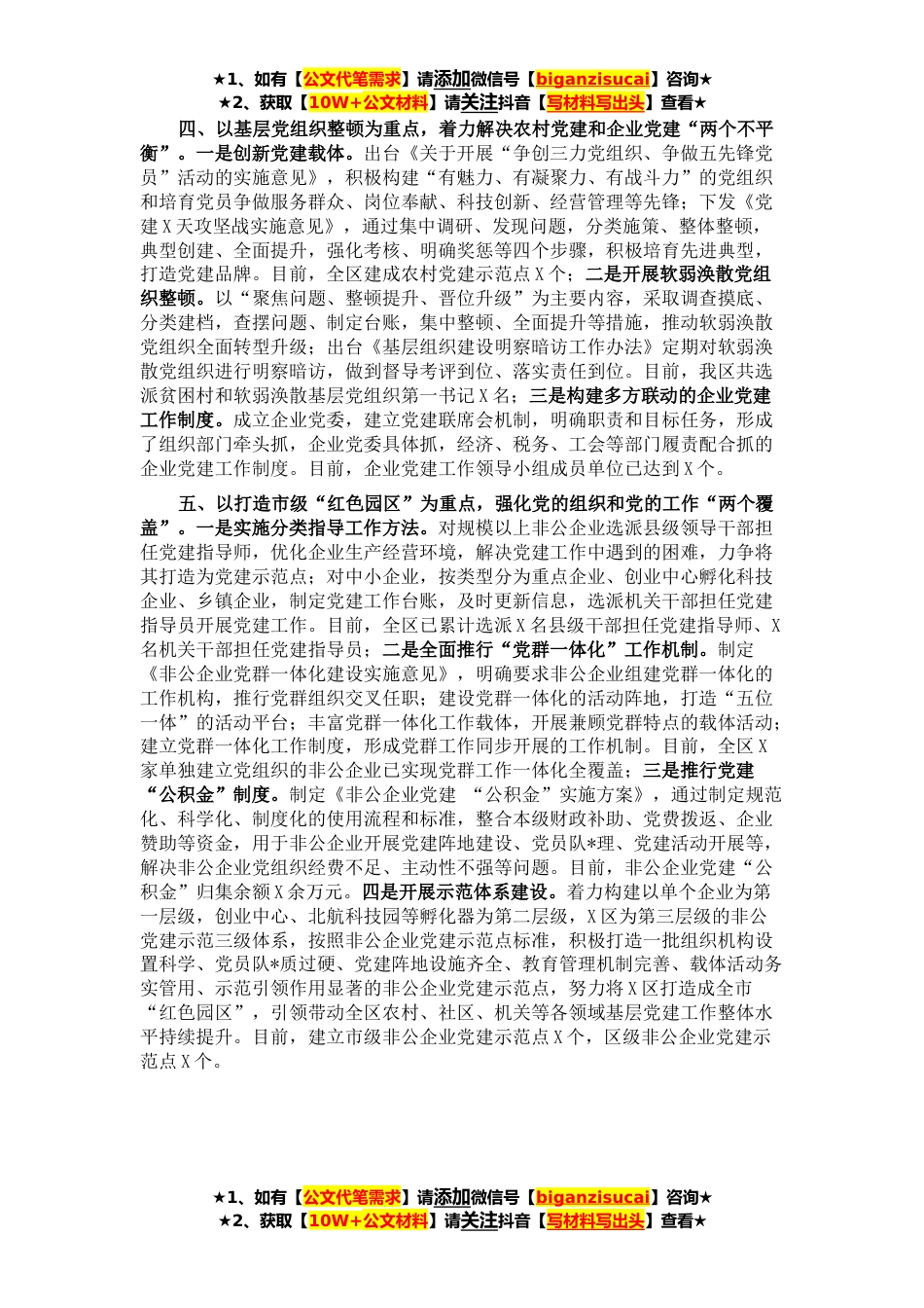 ★1、如有【公文代笔需求】请添加微信号【biganzisucai】咨询★★2、获取【10W+公文材料】请关注抖音【写材料写出头】查看★今年以来,X区把贯彻落实X巩固提升年各项工作任务作为抓好基层党建工作的重要载体和有效抓手,科学谋划,统筹推进,着力增强“两大功能”、建好“两支队*、抓好“两个保障”、解决“两个不平衡”问题、实现“两个覆盖”,促进全区基层组织各项工作全面提升、全面过硬。现将工作开展情况汇报如下:一、以推进党史学习教育为重点,着力提升基层党组织政治和服务“两个功能”一是注重制度规范。出台《X区基层党建工作规范X条》,明确了党委、党总支和党员的“规定动作”,进一步严肃党内政治生活,规范“三会一课”制度、组织生活会、党支部主题党日等制度;二是注重学习载体。以“XX组工”*...
