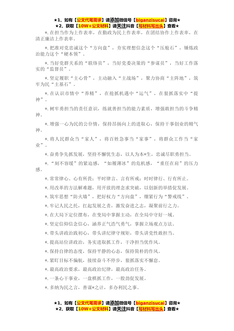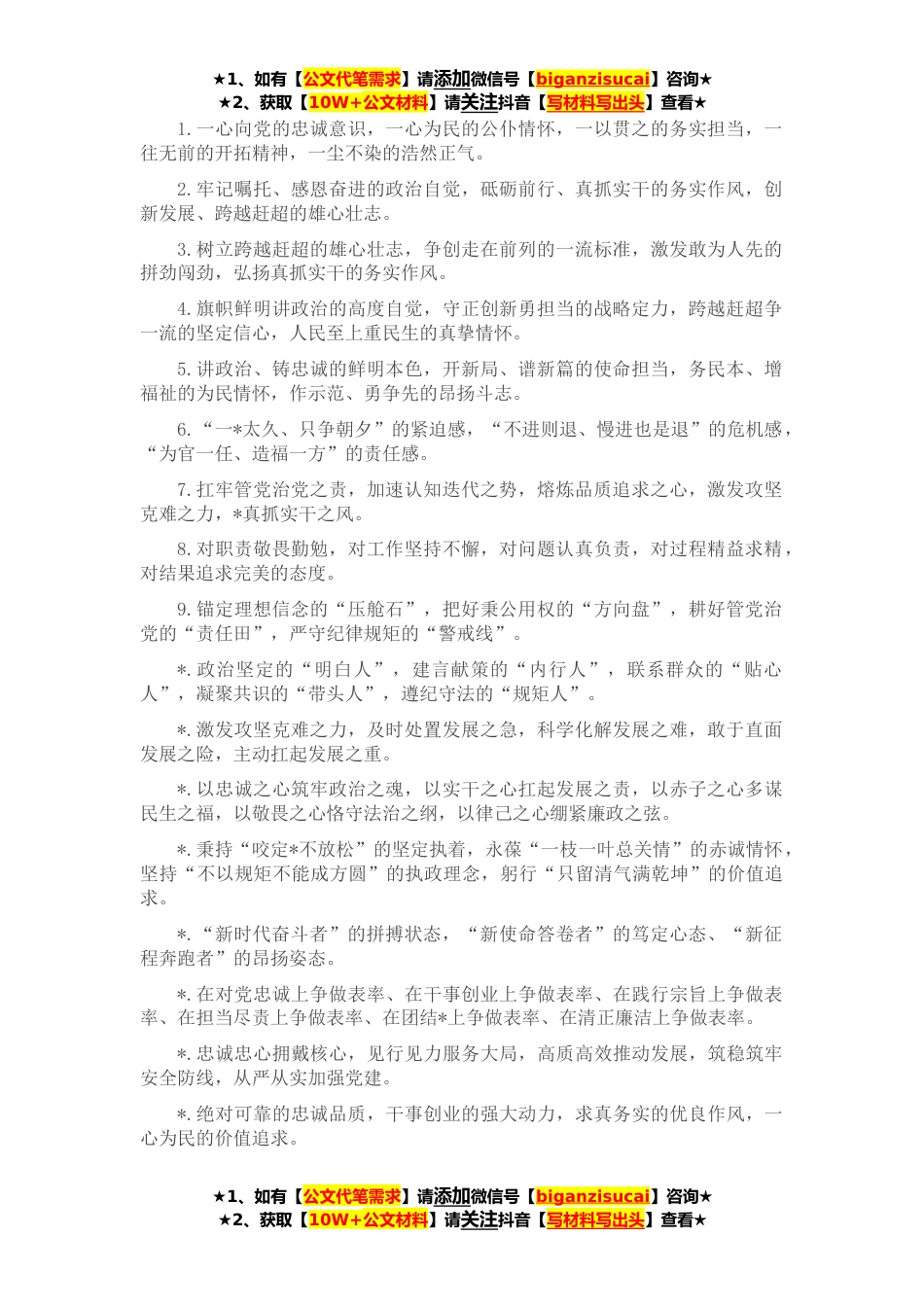 ★1、如有【公文代笔需求】请添加微信号【biganzisucai】咨询★★2、获取【10W+公文材料】请关注抖音【写材料写出头】查看★1.一心向党的忠诚意识,一心为民的公仆情怀,一以贯之的务实担当,一往无前的开拓精神,一尘不染的浩然正气。2.牢记嘱托、感恩奋进的政治自觉,砥砺前行、真抓实干的务实作风,创新发展、跨越赶超的雄心壮志。3.树立跨越赶超的雄心壮志,争创走在前列的一流标准,激发敢为人先的拼劲闯劲,弘扬真抓实干的务实作风。4.旗帜鲜明讲政治的高度自觉,守正创新勇担当的战略定力,跨越赶超争一流的坚定信心,人民至上重民生的真挚情怀。5.讲政治、铸忠诚的鲜明本色,开新局、谱新篇的使命担当,务民本、增福祉的为民情怀,作示范、勇争先的昂扬斗志。6.“一*太久、只争朝夕”的紧迫感,“不进则退...