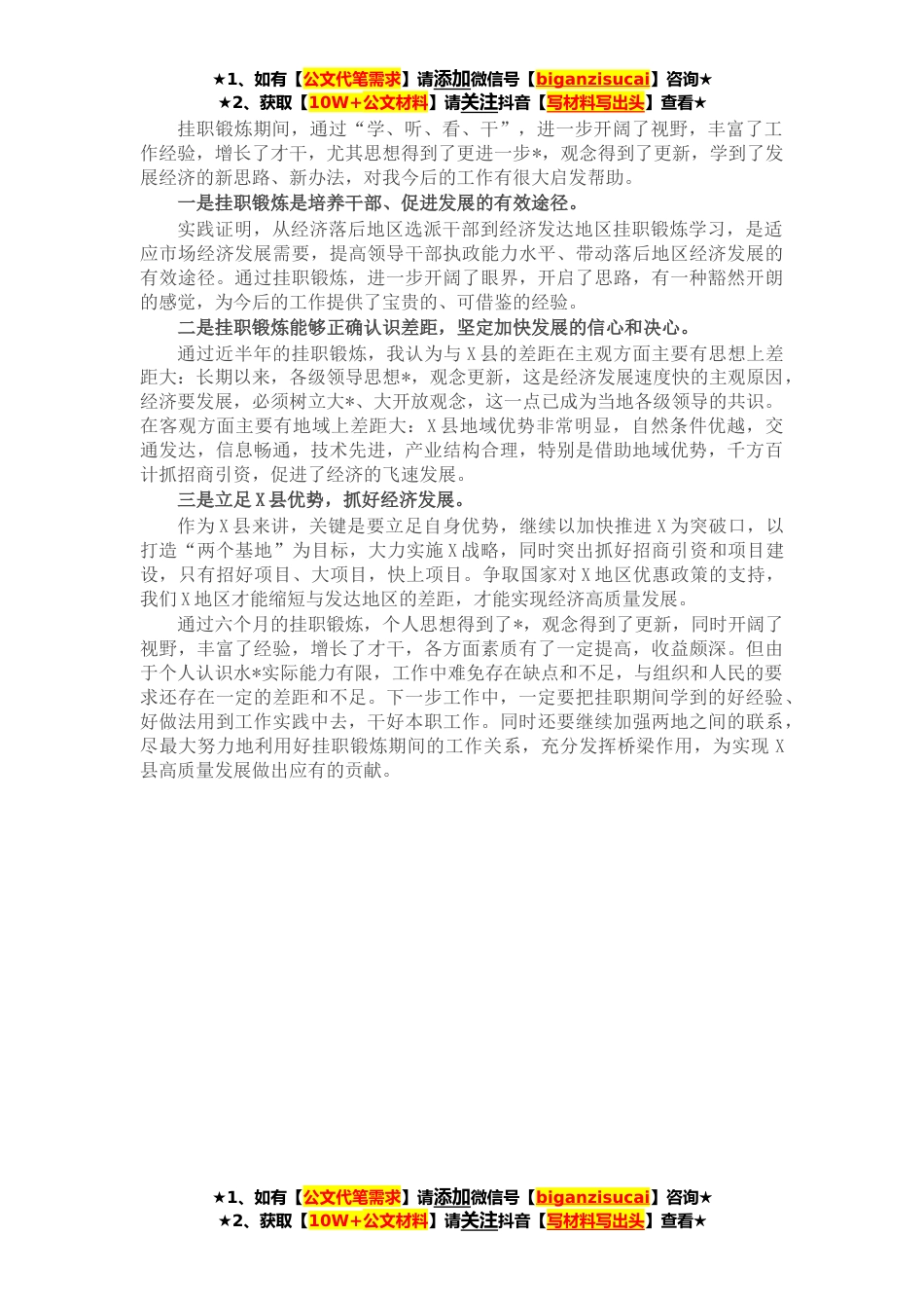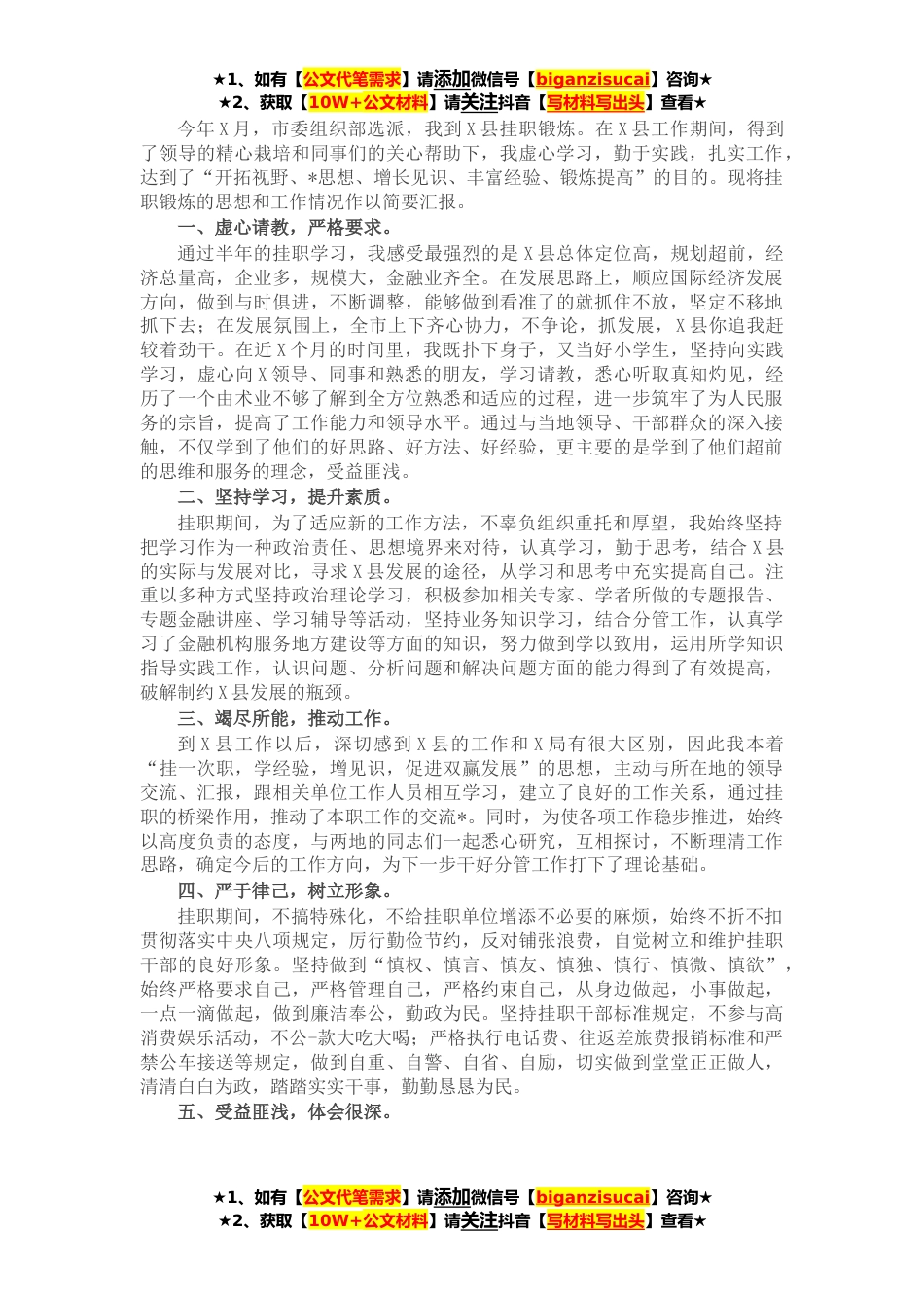 ★1、如有【公文代笔需求】请添加微信号【biganzisucai】咨询★★2、获取【10W+公文材料】请关注抖音【写材料写出头】查看★今年X月,市委组织部选派,我到X县挂职锻炼。在X县工作期间,得到了领导的精心栽培和同事们的关心帮助下,我虚心学习,勤于实践,扎实工作,达到了“开拓视野、*思想、增长见识、丰富经验、锻炼提高”的目的。现将挂职锻炼的思想和工作情况作以简要汇报。一、虚心请教,严格要求。通过半年的挂职学习,我感受最强烈的是X县总体定位高,规划超前,经济总量高,企业多,规模大,金融业齐全。在发展思路上,顺应国际经济发展方向,做到与时俱进,不断调整,能够做到看准了的就抓住不放,坚定不移地抓下去;在发展氛围上,全市上下齐心协力,不争论,抓发展,X县你追我赶较着劲干。在近X个月的...
