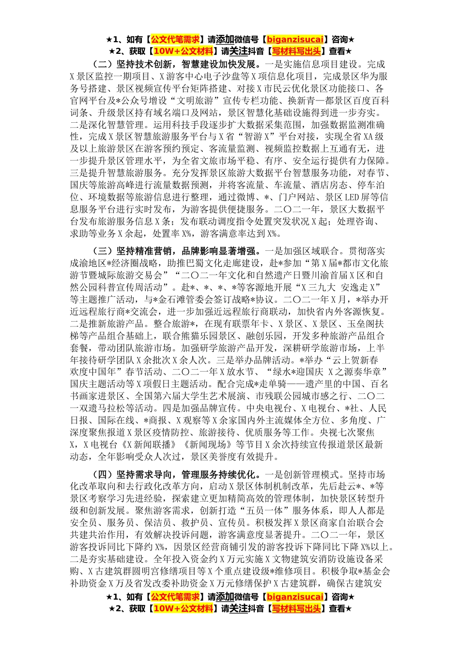 ★1、如有【公文代笔需求】请添加微信号【biganzisucai】咨询★★2、获取【10W+公文材料】请关注抖音【写材料写出头】查看★二〇二一年,在市委、市政府科学领导下,X局积极应对旅游市场发展低迷、新冠疫情冲击等多重挑战,坚持高质量发展,各项工作有序开展。一、主要成效(一)旅游接待实现稳步增长。截止二〇二一年X月,X景区共接待游客X万人,实现门票收入X亿元,分别同比增长X%、X%,圆满完成X等重大外事接待X批次,省(市)级接待X批次、X人次。(二)综合管理水平显著提升。*创建国家级文明旅游示范单位、国家级旅游科技示范园区试点单位,荣获“首届X市市长质量奖”,在X旅游命名县提升建设、重大外事接待、疫情防控、第二轮中央生态环境保护督察、新冠肺炎病毒疫苗接种等工作中均获先进集体荣誉称号。(...