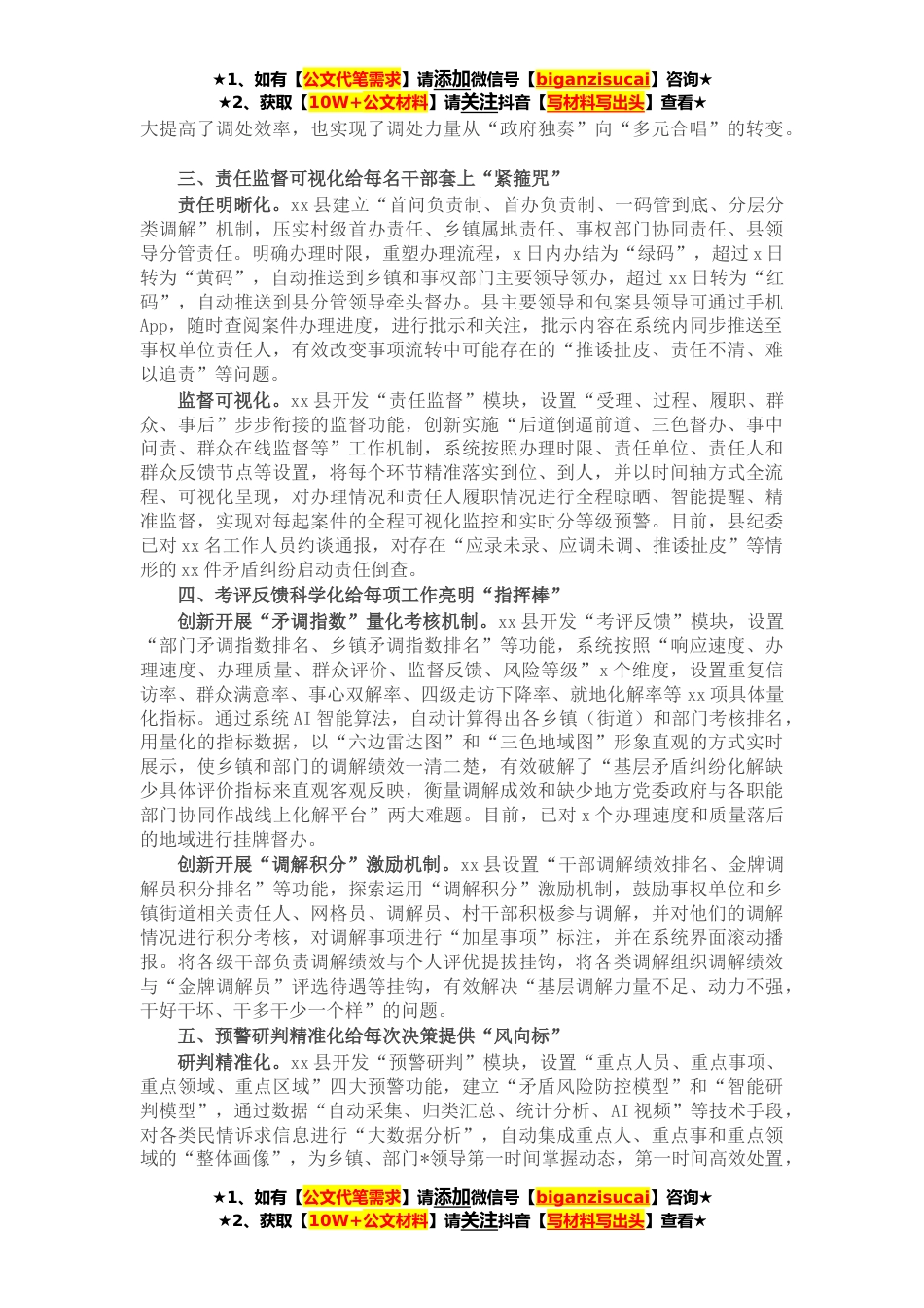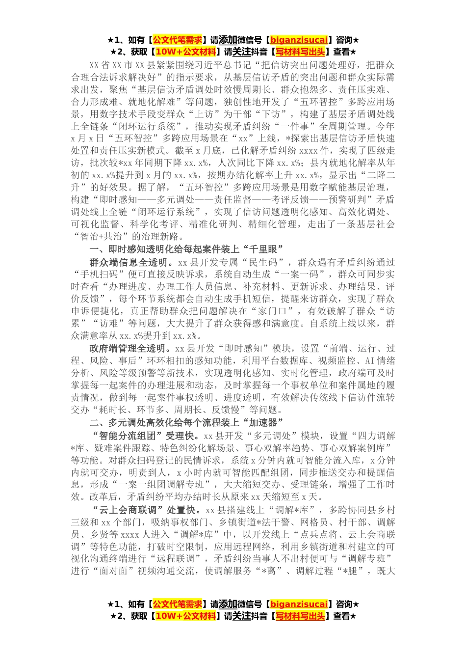 ★1、如有【公文代笔需求】请添加微信号【biganzisucai】咨询★★2、获取【10W+公文材料】请关注抖音【写材料写出头】查看★XX省XX市XX县紧紧围绕习近平总书记“把信访突出问题处理好,把群众合理合法诉求解决好”的指示要求,从基层信访矛盾的突出问题和群众实际需求出发,聚焦“基层信访矛盾调处时效慢周期长、群众抱怨多、责任压实难、合力形成难、就地化解难”等问题,独创性地开发了“五环智控”多跨应用场景,用数字技术手段变群众“上访”为干部“下访”,构建了基层矛盾调处线上全链条“闭环运行系统”,推动实现矛盾纠纷“一件事”全周期管理。今年x月x日“五环智控”多跨应用场景在“xx”上线,*探索出基层信访矛盾快速处置和责任压实新模式。截至x月底,已化解矛盾纠纷xxxx件,实现了四级走访,批次较*...