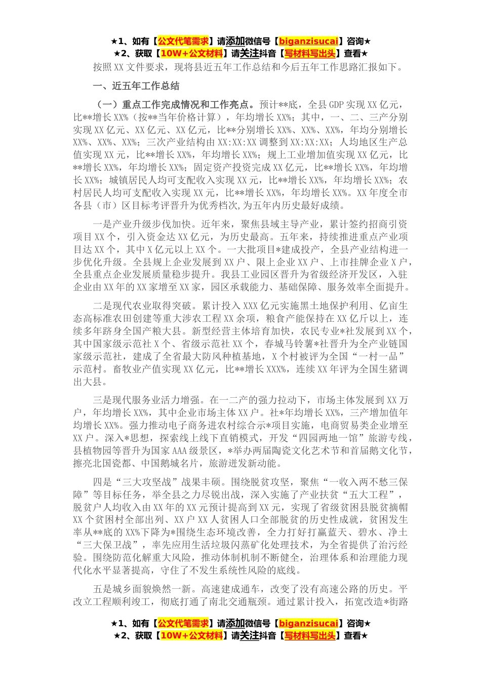 ★1、如有【公文代笔需求】请添加微信号【biganzisucai】咨询★★2、获取【10W+公文材料】请关注抖音【写材料写出头】查看★按照XX文件要求,现将县近五年工作总结和今后五年工作思路汇报如下。一、近五年工作总结(一)重点工作完成情况和工作亮点。预计**底,全县GDP实现XX亿元,比**增长XX%(按**当年价格计算),年均增长XX%;其中,一、二、三产分别实现XX亿元、XX亿元、XX亿元,比**分别增长XX%、XX%、XX%,年均分别增长XX%、XX%、XX%;三次产业结构由XX:XX:XX调整到XX:XX:XX;人均地区生产总值实现XX元,比**增长XX%,年均增长XX%;规上工业增加值实现XX亿元,比**增长XX%,年均增长XX%;固定资产投资完成XX亿元,比**增长XX%,年均增长XX%;城镇居民人均可支配收入实现XX元,比**增长XX%,年均增长XX%;农...