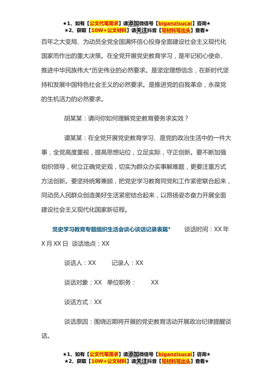 ★1、如有【公文代笔需求】请添加微信号【biganzisucai】咨询★★2、获取【10W+公文材料】请关注抖音【写材料写出头】查看★党史学习教育专题组织生活会谈心谈话记录表篇*胡某某:请你谈谈你对党史教育学习的收获?谭某某:首先:经过全党全国各族人民持续奋斗,我们实现了第一个百年奋斗目标,在中华大地全面建成了小康社会。其次:一百年来党团结带领人民进行的一切奋斗、一切牺牲、一切创造,归结起来就是一个主题:实现中华民族伟大*。最后:深刻领悟习总书记鲜明提出了坚持真理、坚守理想,践行初心、担当使命,不怕牺牲、英勇奋战,对党忠诚、不负人民的伟大精神。我作为一名党员要积极响应习总书记向全党发出伟大号召,努力为党和人民争取更大荣光。胡某某:请你谈谈作为党员如何践行先锋模范作用?谭某某...