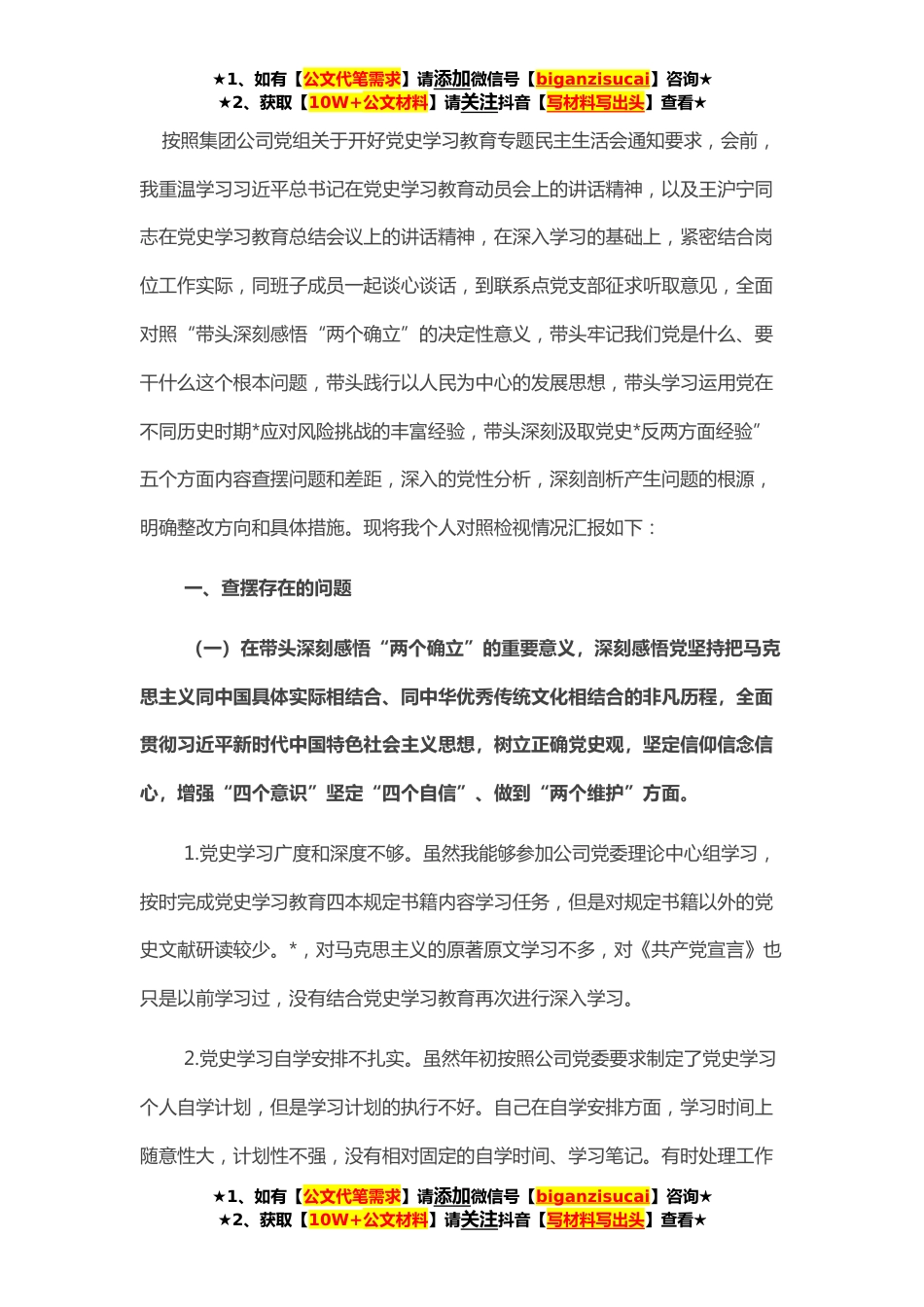 ★1、如有【公文代笔需求】请添加微信号【biganzisucai】咨询★★2、获取【10W+公文材料】请关注抖音【写材料写出头】查看★按照集团公司党组关于开好党史学习教育专题民主生活会通知要求,会前,我重温学习习近平总书记在党史学习教育动员会上的讲话精神,以及王沪宁同志在党史学习教育总结会议上的讲话精神,在深入学习的基础上,紧密结合岗位工作实际,同班子成员一起谈心谈话,到联系点党支部征求听取意见,全面对照“带头深刻感悟“两个确立”的决定性意义,带头牢记我们党是什么、要干什么这个根本问题,带头践行以人民为中心的发展思想,带头学习运用党在不同历史时期*应对风险挑战的丰富经验,带头深刻汲取党史*反两方面经验”五个方面内容查摆问题和差距,深入的党性分析,深刻剖析产生问题的根源,明确...