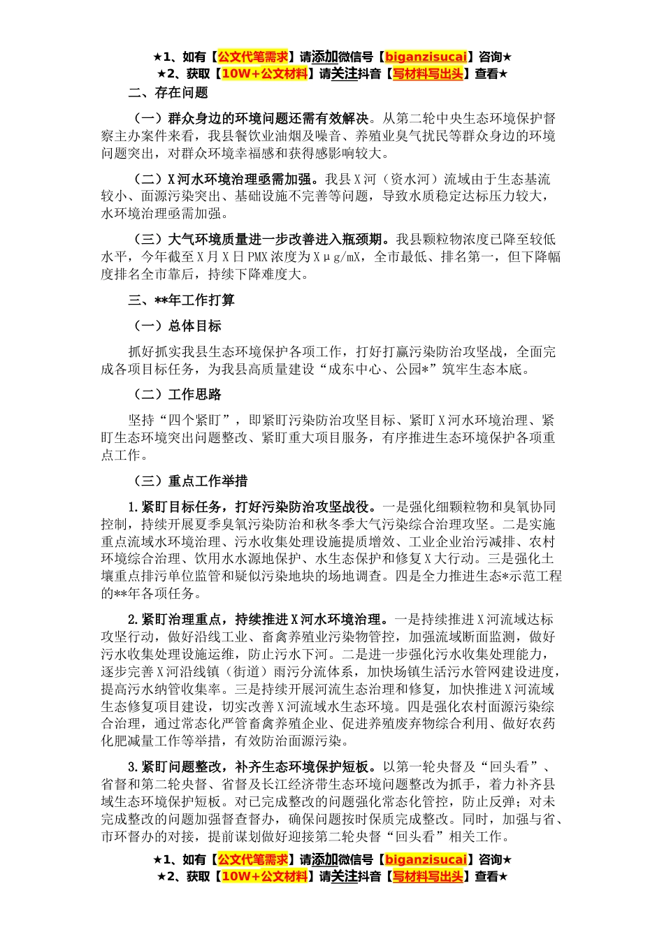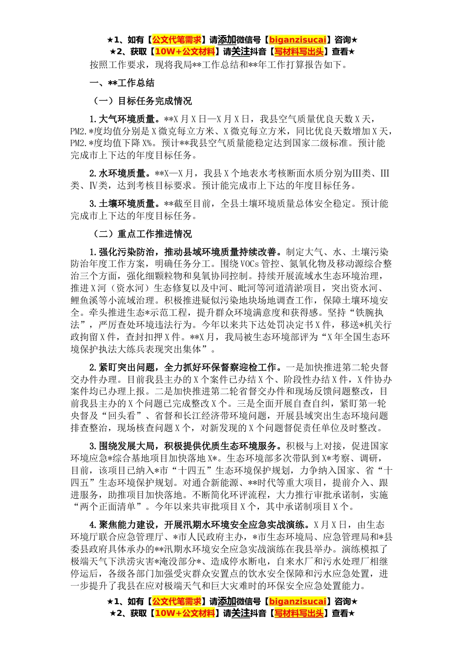 ★1、如有【公文代笔需求】请添加微信号【biganzisucai】咨询★★2、获取【10W+公文材料】请关注抖音【写材料写出头】查看★按照工作要求,现将我局**工作总结和**年工作打算报告如下。一、**工作总结(一)目标任务完成情况1.大气环境质量。**X月X日—X月X日,我县空气质量优良天数X天,PM2.*度均值分别是X微克每立方米、X微克每立方米,同比优良天数增加X天,PM2.*度均值下降X%。预计**我县空气质量能稳定达到国家二级标准。预计能完成市上下达的年度目标任务。2.水环境质量。**X—X月,我县X个地表水考核断面水质分别为Ⅲ类、Ⅲ类、Ⅳ类,达到考核目标要求。预计能完成市上下达的年度目标任务。3.土壤环境质量。**截至目前,全县土壤环境质量总体安全稳定。预计能完成市上下达的年度目标任务。(二)重点工作推...