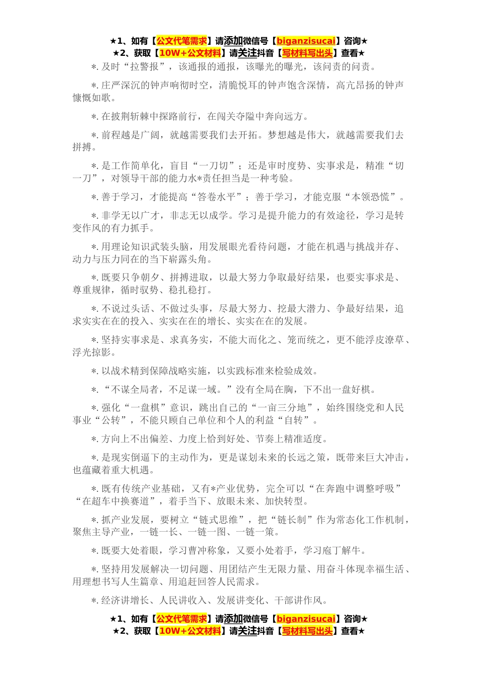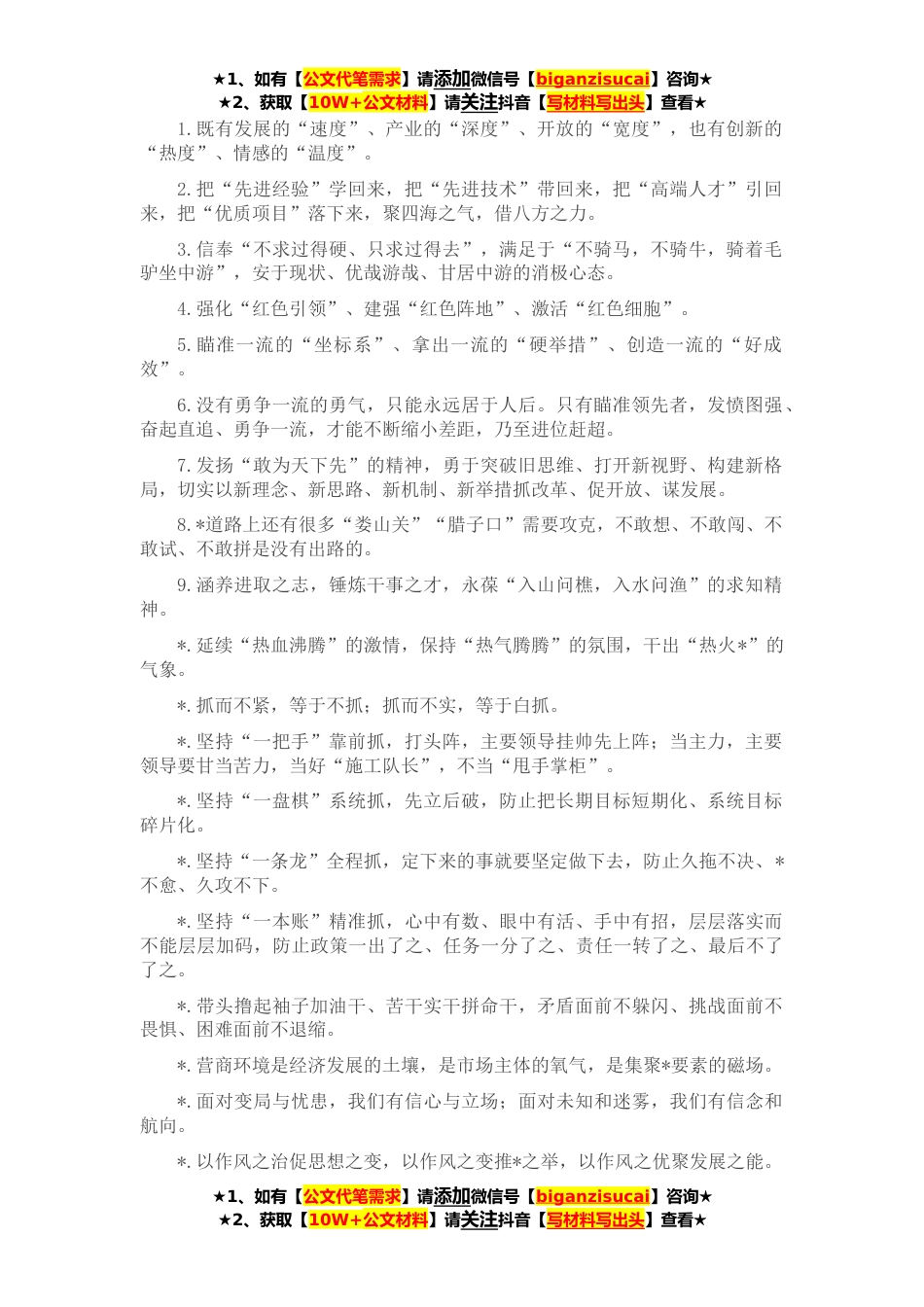★1、如有【公文代笔需求】请添加微信号【biganzisucai】咨询★★2、获取【10W+公文材料】请关注抖音【写材料写出头】查看★1.既有发展的“速度”、产业的“深度”、开放的“宽度”,也有创新的“热度”、情感的“温度”。2.把“先进经验”学回来,把“先进技术”带回来,把“高端人才”引回来,把“优质项目”落下来,聚四海之气,借八方之力。3.信奉“不求过得硬、只求过得去”,满足于“不骑马,不骑牛,骑着毛驴坐中游”,安于现状、优哉游哉、甘居中游的消极心态。4.强化“红色引领”、建强“红色阵地”、激活“红色细胞”。5.瞄准一流的“坐标系”、拿出一流的“硬举措”、创造一流的“好成效”。6.没有勇争一流的勇气,只能永远居于人后。只有瞄准领先者,发愤图强、奋起直追、勇争一流,才能不断缩小差距...