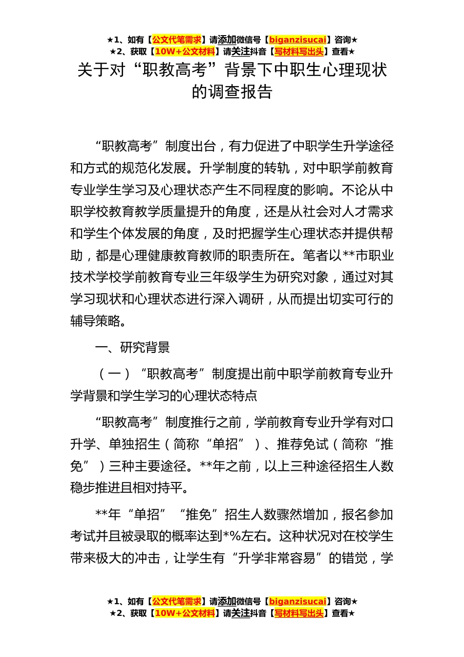 ★1、如有【公文代笔需求】请添加微信号【biganzisucai】咨询★★2、获取【10W+公文材料】请关注抖音【写材料写出头】查看★★1、如有【公文代笔需求】请添加微信号【biganzisucai】咨询★★2、获取【10W+公文材料】请关注抖音【写材料写出头】查看★★1、如有【公文代笔需求】请添加微信号【biganzisucai】咨询★★2、获取【10W+公文材料】请关注抖音【写材料写出头】查看★关于对“职教高考”背景下中职生心理现状的调查报告“职教高考”制度出台,有力促进了中职学生升学途径和方式的规范化发展。升学制度的转轨,对中职学前教育专业学生学习及心理状态产生不同程度的影响。不论从中职学校教育教学质量提升的角度,还是从社会对人才需求和学生个体发展的角度,及时把握学生心理状态并提供帮助,都是心理健康教...