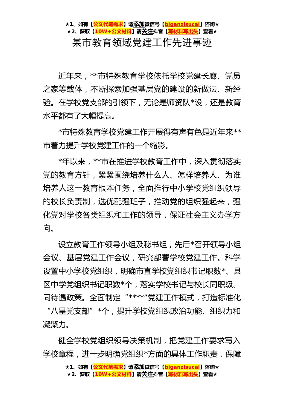 ★1、如有【公文代笔需求】请添加微信号【biganzisucai】咨询★★2、获取【10W+公文材料】请关注抖音【写材料写出头】查看★★1、如有【公文代笔需求】请添加微信号【biganzisucai】咨询★★2、获取【10W+公文材料】请关注抖音【写材料写出头】查看★★1、如有【公文代笔需求】请添加微信号【biganzisucai】咨询★★2、获取【10W+公文材料】请关注抖音【写材料写出头】查看★某市教育领域党建工作先进事迹近年来,**市特殊教育学校依托学校党建长廊、党员之家等载体,不断探索加强基层党的建设的新做法、新经验。在学校党支部的引领下,无论是师资队*设,还是教育水平都有了大幅提高。*市特殊教育学校党建工作开展得有声有色是近年来**市着力提升学校党建工作的一个缩影。*年以来,**市在推进学校教育工作中,深入...