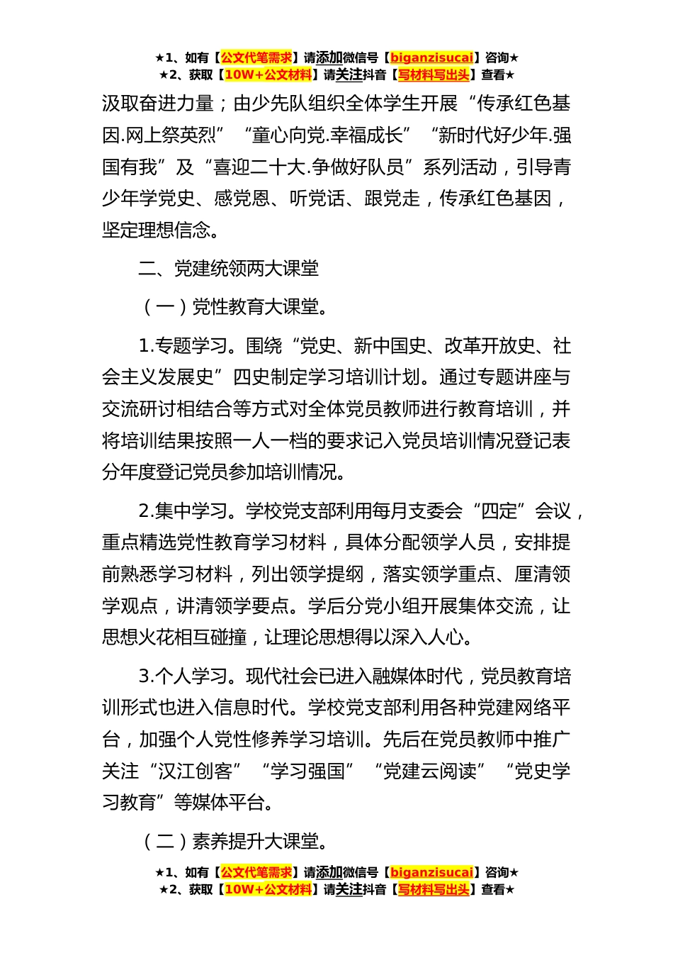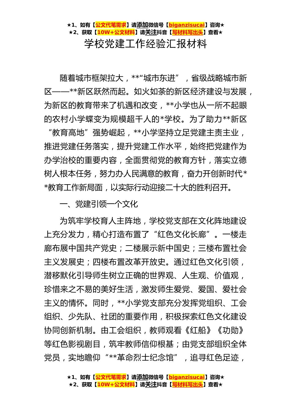 ★1、如有【公文代笔需求】请添加微信号【biganzisucai】咨询★★2、获取【10W+公文材料】请关注抖音【写材料写出头】查看★学校党建工作经验汇报材料随着城市框架拉大,**“城市东进”,省级战略城市新区——**新区跃然而起。如火如荼的新区经济建设与发展,为新区的教育带来了机遇和改变,**小学也从一所不起眼的农村小学蝶变为规模超千人的*学校。为了助力**新区“教育高地”强势崛起,**小学坚持立足党建主责主业,推进党建任务落实,提升党建工作水平,始终把党建作为办学治校的重要内容,全面贯彻党的教育方针,落实立德树人根本任务,努力办人民满意的教育,奋力开创新时代**教育工作新局面,以实际行动迎接二十大的胜利召开。一、党建引领一个文化为筑牢学校育人主阵地,学校党支部在文化阵地建设上充分发...