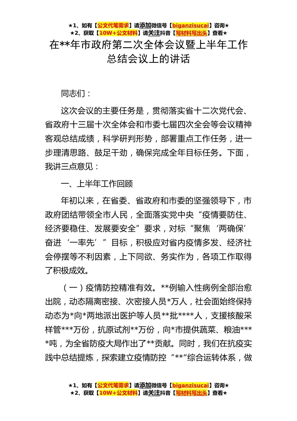 ★1、如有【公文代笔需求】请添加微信号【biganzisucai】咨询★★2、获取【10W+公文材料】请关注抖音【写材料写出头】查看★在**年市政府第二次全体会议暨上半年工作总结会议上的讲话同志们:这次会议的主要任务是,贯彻落实省十二次党代会、省政府十三届十次全体会和市委七届四次全会等会议精神客观总结成绩,科学研判形势,部署重点工作任务,进一步理清思路、鼓足干劲,确保完成全年目标任务。下面,我讲三点意见:一、上半年工作回顾年初以来,在省委、省政府和市委的坚强领导下,市政府团结带领全市人民,全面落实党中央“疫情要防住、经济要稳住、发展要安全”要求,对标“聚焦‘两确保’奋进‘一率先’”目标,积极应对省内疫情多发、经济社会停摆等不利因素,上下同欲、务实作为,各项工作取得了积极成效...