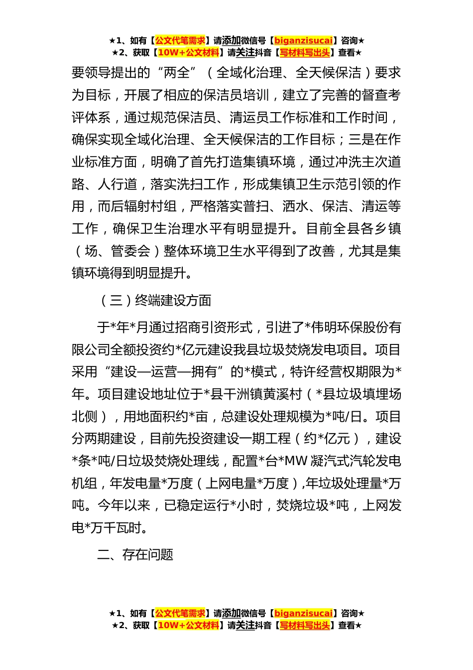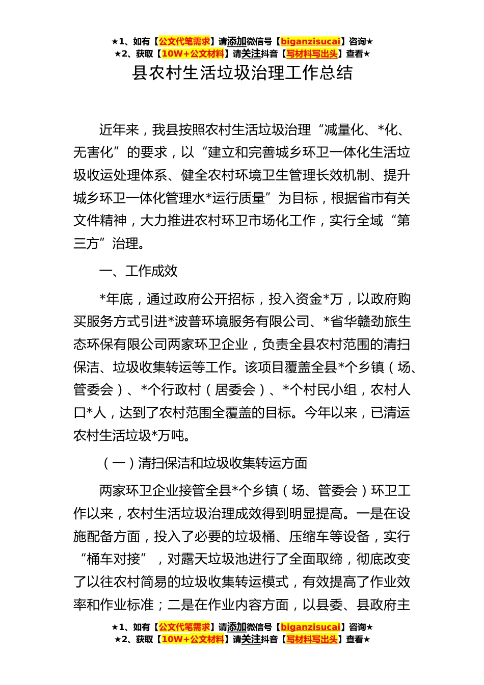 ★1、如有【公文代笔需求】请添加微信号【biganzisucai】咨询★★2、获取【10W+公文材料】请关注抖音【写材料写出头】查看★县农村生活垃圾治理工作总结近年来,我县按照农村生活垃圾治理“减量化、*化、无害化”的要求,以“建立和完善城乡环卫一体化生活垃圾收运处理体系、健全农村环境卫生管理长效机制、提升城乡环卫一体化管理水*运行质量”为目标,根据省市有关文件精神,大力推进农村环卫市场化工作,实行全域“第三方”治理。一、工作成效*年底,通过政府公开招标,投入资金*万,以政府购买服务方式引进*波普环境服务有限公司、*省华赣劲旅生态环保有限公司两家环卫企业,负责全县农村范围的清扫保洁、垃圾收集转运等工作。该项目覆盖全县*个乡镇(场、管委会)、*个行政村(居委会)、*个村民小组,农村人...