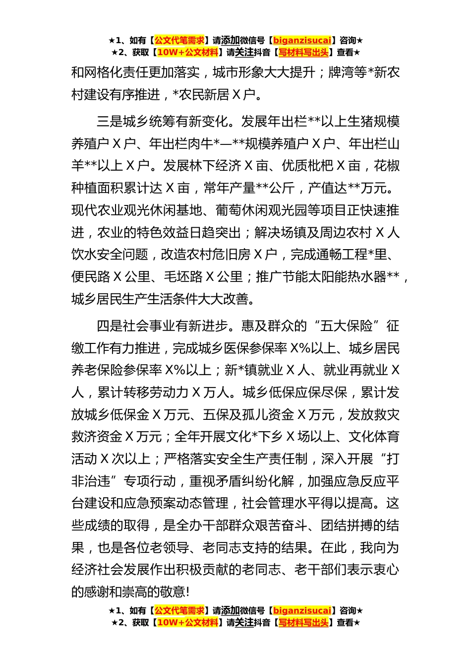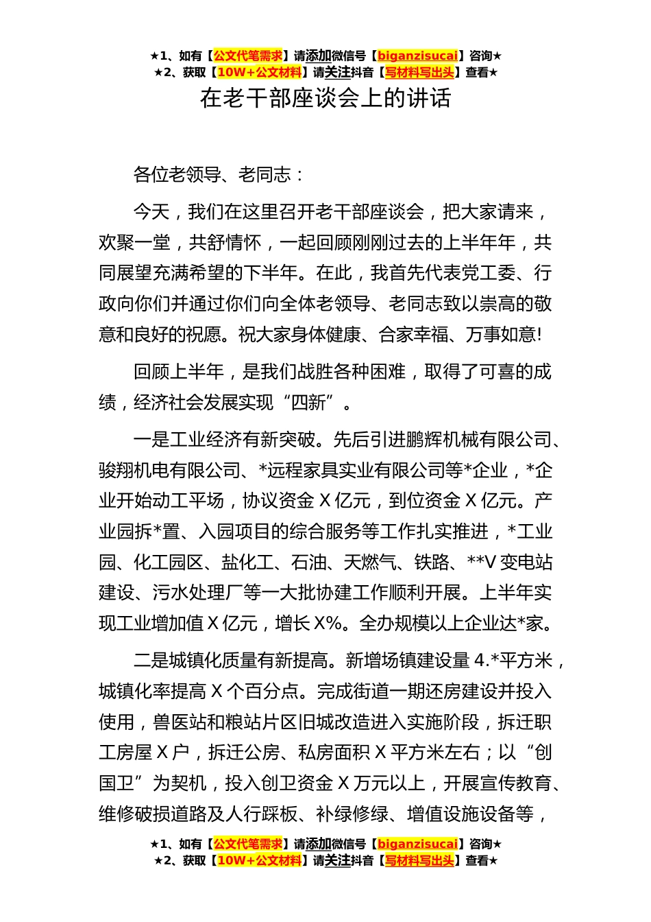 ★1、如有【公文代笔需求】请添加微信号【biganzisucai】咨询★★2、获取【10W+公文材料】请关注抖音【写材料写出头】查看★在老干部座谈会上的讲话各位老领导、老同志:今天,我们在这里召开老干部座谈会,把大家请来,欢聚一堂,共舒情怀,一起回顾刚刚过去的上半年年,共同展望充满希望的下半年。在此,我首先代表党工委、行政向你们并通过你们向全体老领导、老同志致以崇高的敬意和良好的祝愿。祝大家身体健康、合家幸福、万事如意!回顾上半年,是我们战胜各种困难,取得了可喜的成绩,经济社会发展实现“四新”。一是工业经济有新突破。先后引进鹏辉机械有限公司、骏翔机电有限公司、*远程家具实业有限公司等*企业,*企业开始动工平场,协议资金X亿元,到位资金X亿元。产业园拆*置、入园项目的综合服务等工作...