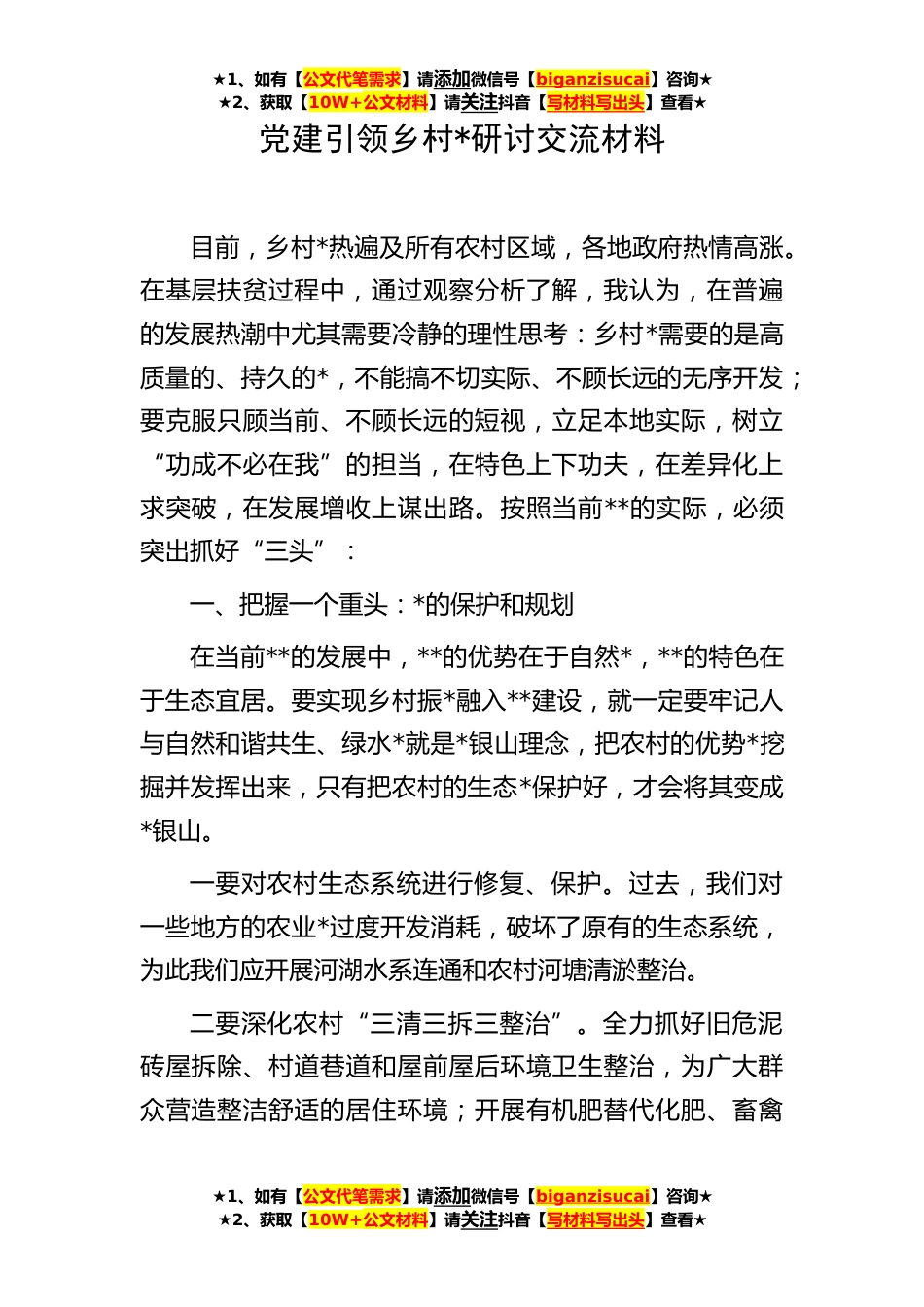 ★1、如有【公文代笔需求】请添加微信号【biganzisucai】咨询★★2、获取【10W+公文材料】请关注抖音【写材料写出头】查看★★1、如有【公文代笔需求】请添加微信号【biganzisucai】咨询★★2、获取【10W+公文材料】请关注抖音【写材料写出头】查看★★1、如有【公文代笔需求】请添加微信号【biganzisucai】咨询★★2、获取【10W+公文材料】请关注抖音【写材料写出头】查看★党建引领乡村*研讨交流材料目前,乡村*热遍及所有农村区域,各地政府热情高涨。在基层扶贫过程中,通过观察分析了解,我认为,在普遍的发展热潮中尤其需要冷静的理性思考:乡村*需要的是高质量的、持久的*,不能搞不切实际、不顾长远的无序开发;要克服只顾当前、不顾长远的短视,立足本地实际,树立“功成不必在我”的担当,在特色上下功...