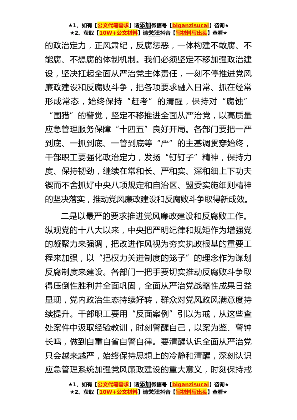 ★1、如有【公文代笔需求】请添加微信号【biganzisucai】咨询★★2、获取【10W+公文材料】请关注抖音【写材料写出头】查看★在党风廉政建设专题会议暨“一岗双责”工作部署会上的讲话同志们:我们召开本次党风廉政建设专题会议暨“一岗双责”工作部署会,主要目的是进一步深入贯彻落实中央、自治区和盟委关于加强党风廉政建设和反腐败斗争的决策部署以更高的标准、更严的要求落实全面从严治党主体责任,给开发区干部职工再打免疫针、敲警示钟、上廉政课,着力营造风清气正的从政环境和发展环境,努力开创清正、清廉、清明新局面。刚才,我通报了全盟纪检监察机关查办有关违纪违法案件情况,由于涉案人员自律不严、纪律不守,最终违法违规,既令人痛心,又发人深省。希望大家要引以为戒、深刻反思,时刻警醒、警钟...