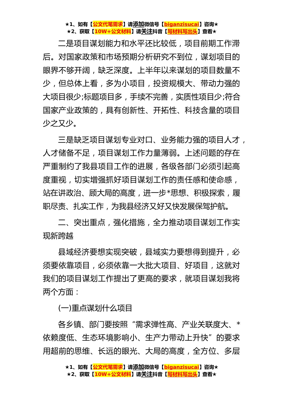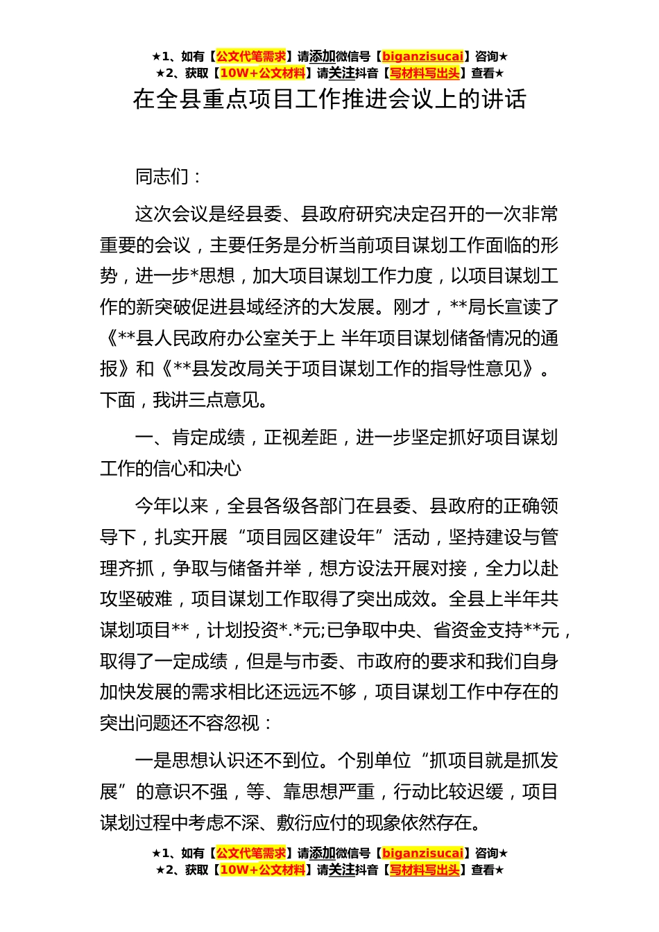 ★1、如有【公文代笔需求】请添加微信号【biganzisucai】咨询★★2、获取【10W+公文材料】请关注抖音【写材料写出头】查看★在全县重点项目工作推进会议上的讲话同志们:这次会议是经县委、县政府研究决定召开的一次非常重要的会议,主要任务是分析当前项目谋划工作面临的形势,进一步*思想,加大项目谋划工作力度,以项目谋划工作的新突破促进县域经济的大发展。刚才,**局长宣读了《**县人民政府办公室关于上半年项目谋划储备情况的通报》和《**县发改局关于项目谋划工作的指导性意见》。下面,我讲三点意见。一、肯定成绩,正视差距,进一步坚定抓好项目谋划工作的信心和决心今年以来,全县各级各部门在县委、县政府的正确领导下,扎实开展“项目园区建设年”活动,坚持建设与管理齐抓,争取与储备并举,想方设...