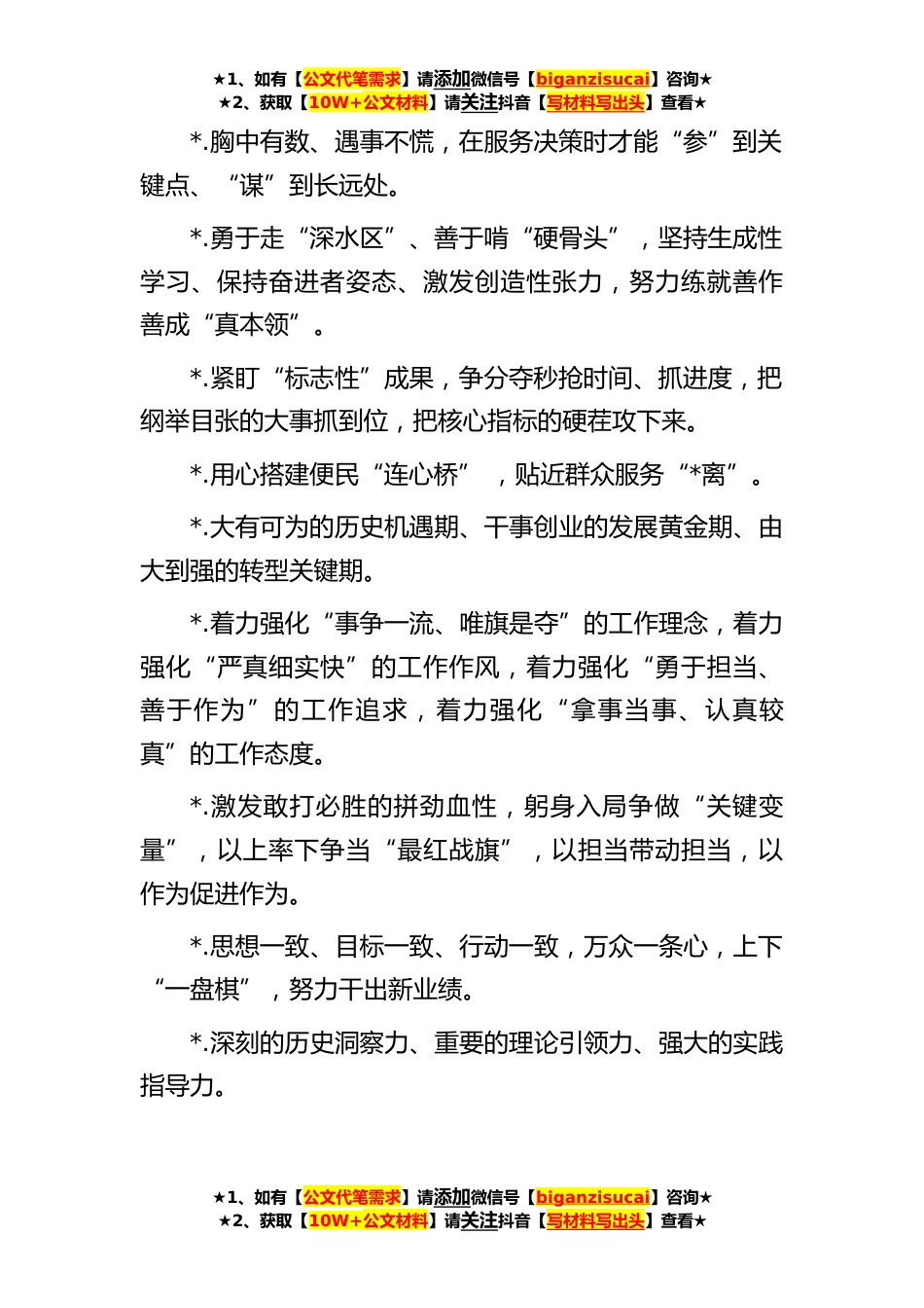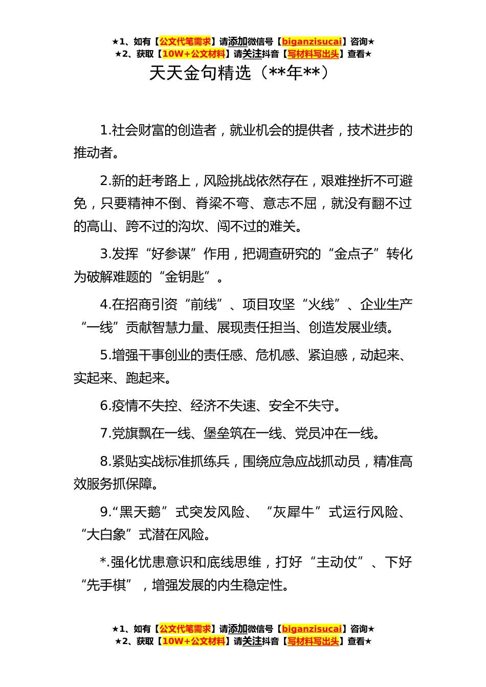 ★1、如有【公文代笔需求】请添加微信号【biganzisucai】咨询★★2、获取【10W+公文材料】请关注抖音【写材料写出头】查看★天天金句精选(**年**)1.社会财富的创造者,就业机会的提供者,技术进步的推动者。2.新的赶考路上,风险挑战依然存在,艰难挫折不可避免,只要精神不倒、脊梁不弯、意志不屈,就没有翻不过的高山、跨不过的沟坎、闯不过的难关。3.发挥“好参谋”作用,把调查研究的“金点子”转化为破解难题的“金钥匙”。4.在招商引资“前线”、项目攻坚“火线”、企业生产“一线”贡献智慧力量、展现责任担当、创造发展业绩。5.增强干事创业的责任感、危机感、紧迫感,动起来、实起来、跑起来。6.疫情不失控、经济不失速、安全不失守。7.党旗飘在一线、堡垒筑在一线、党员冲在一线。8.紧贴实战标准抓练...