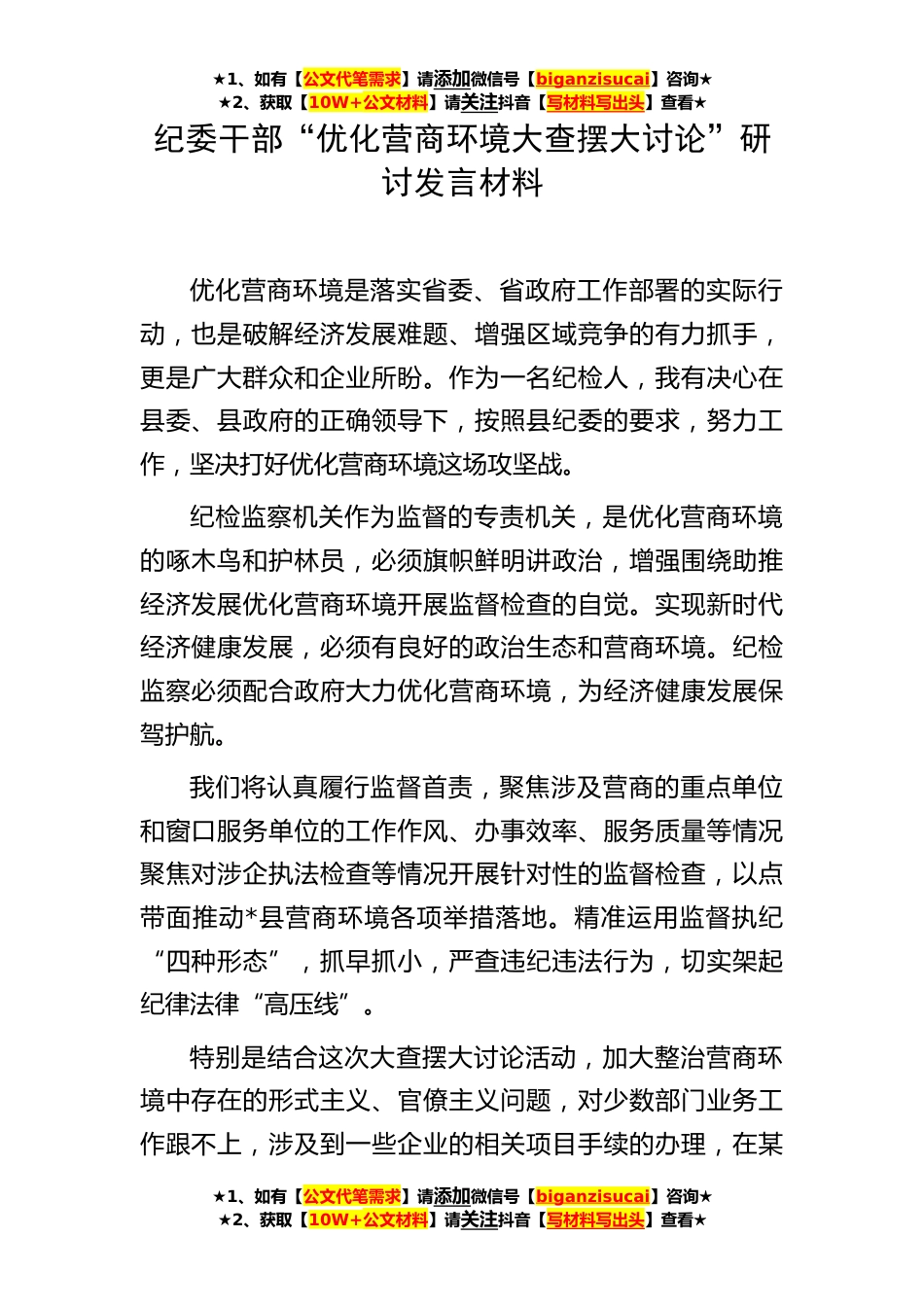 ★1、如有【公文代笔需求】请添加微信号【biganzisucai】咨询★★2、获取【10W+公文材料】请关注抖音【写材料写出头】查看★★1、如有【公文代笔需求】请添加微信号【biganzisucai】咨询★★2、获取【10W+公文材料】请关注抖音【写材料写出头】查看★★1、如有【公文代笔需求】请添加微信号【biganzisucai】咨询★★2、获取【10W+公文材料】请关注抖音【写材料写出头】查看★纪委干部“优化营商环境大查摆大讨论”研讨发言材料优化营商环境是落实省委、省政府工作部署的实际行动,也是破解经济发展难题、增强区域竞争的有力抓手,更是广大群众和企业所盼。作为一名纪检人,我有决心在县委、县政府的正确领导下,按照县纪委的要求,努力工作,坚决打好优化营商环境这场攻坚战。纪检监察机关作为监督的专责机关,是...