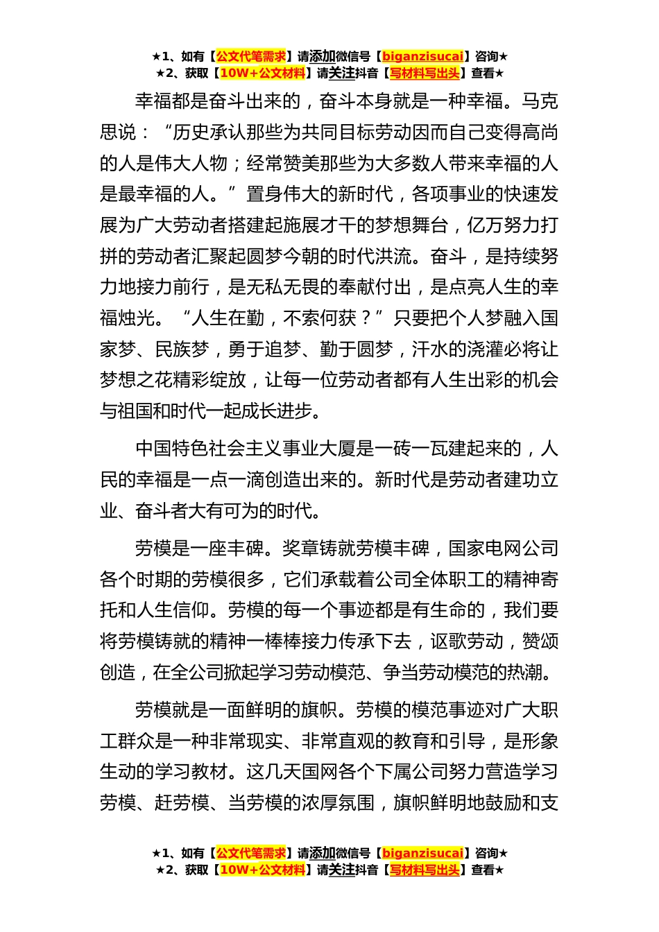 ★1、如有【公文代笔需求】请添加微信号【biganzisucai】咨询★★2、获取【10W+公文材料】请关注抖音【写材料写出头】查看★研讨发言:新时代如何更好地向劳模学习一分耕耘,一分收获,日积月累,从少到多,奇迹就可以创造出来。新时代中国日新月异,各项事业蓬勃兴旺这是广大劳动者勤勤恳恳干出来的。时代在变,但奋斗底色不变。从老一代劳模王进喜、时传祥,到新一代敬业奉献模范罗阳、时代楷模黄大年,还有新近评选出的刘云清王中美等全国五一劳动奖章获得者,正是一代代劳动者接续奋斗,铸就了中国大踏步赶上世界潮流的发展奇迹,实现了中华民族从站起来、富起来到强起来的伟大飞跃,开创了中国特色社会主义蓬勃发展的新时代。新时代是奋斗者的时代。站在新的历史方位和历史起点,迈向决胜全面建成小康社会、...