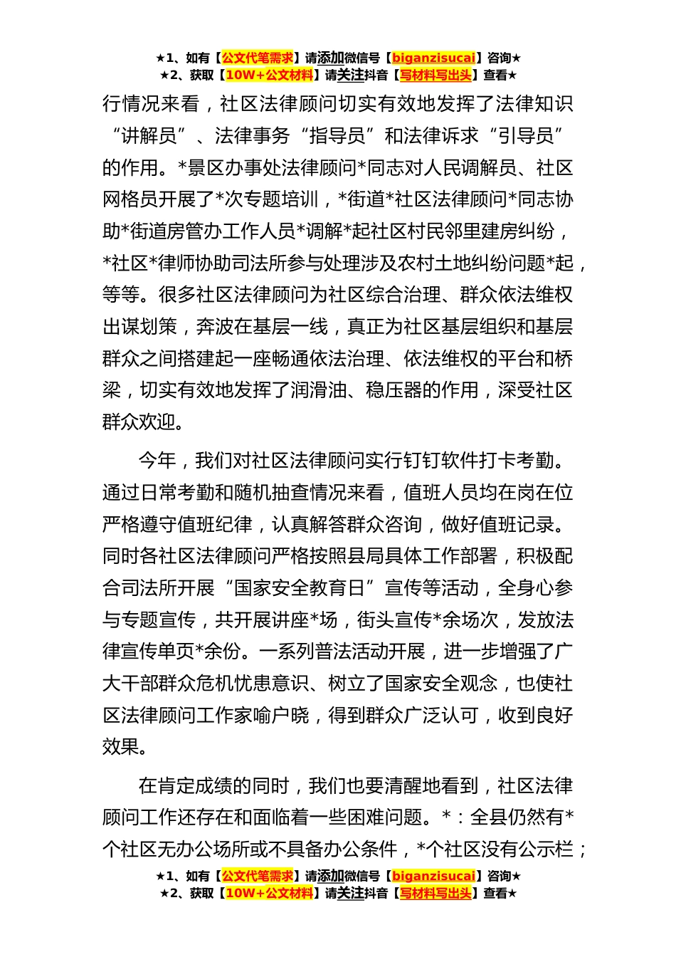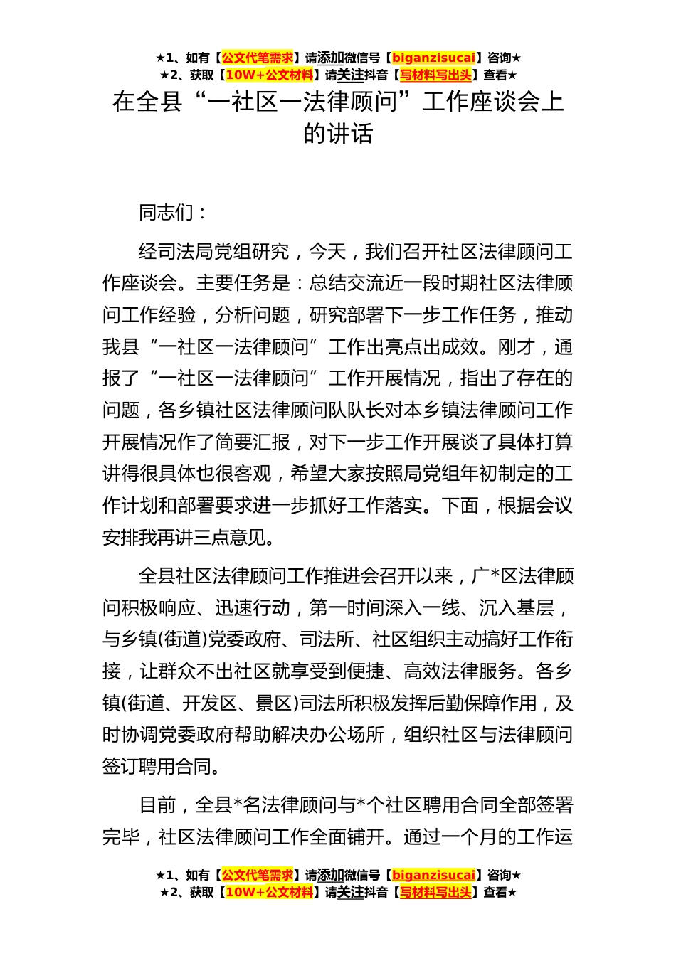 ★1、如有【公文代笔需求】请添加微信号【biganzisucai】咨询★★2、获取【10W+公文材料】请关注抖音【写材料写出头】查看★在全县“一社区一法律顾问”工作座谈会上的讲话同志们:经司法局党组研究,今天,我们召开社区法律顾问工作座谈会。主要任务是:总结交流近一段时期社区法律顾问工作经验,分析问题,研究部署下一步工作任务,推动我县“一社区一法律顾问”工作出亮点出成效。刚才,通报了“一社区一法律顾问”工作开展情况,指出了存在的问题,各乡镇社区法律顾问队队长对本乡镇法律顾问工作开展情况作了简要汇报,对下一步工作开展谈了具体打算讲得很具体也很客观,希望大家按照局党组年初制定的工作计划和部署要求进一步抓好工作落实。下面,根据会议安排我再讲三点意见。全县社区法律顾问工作推进会召...