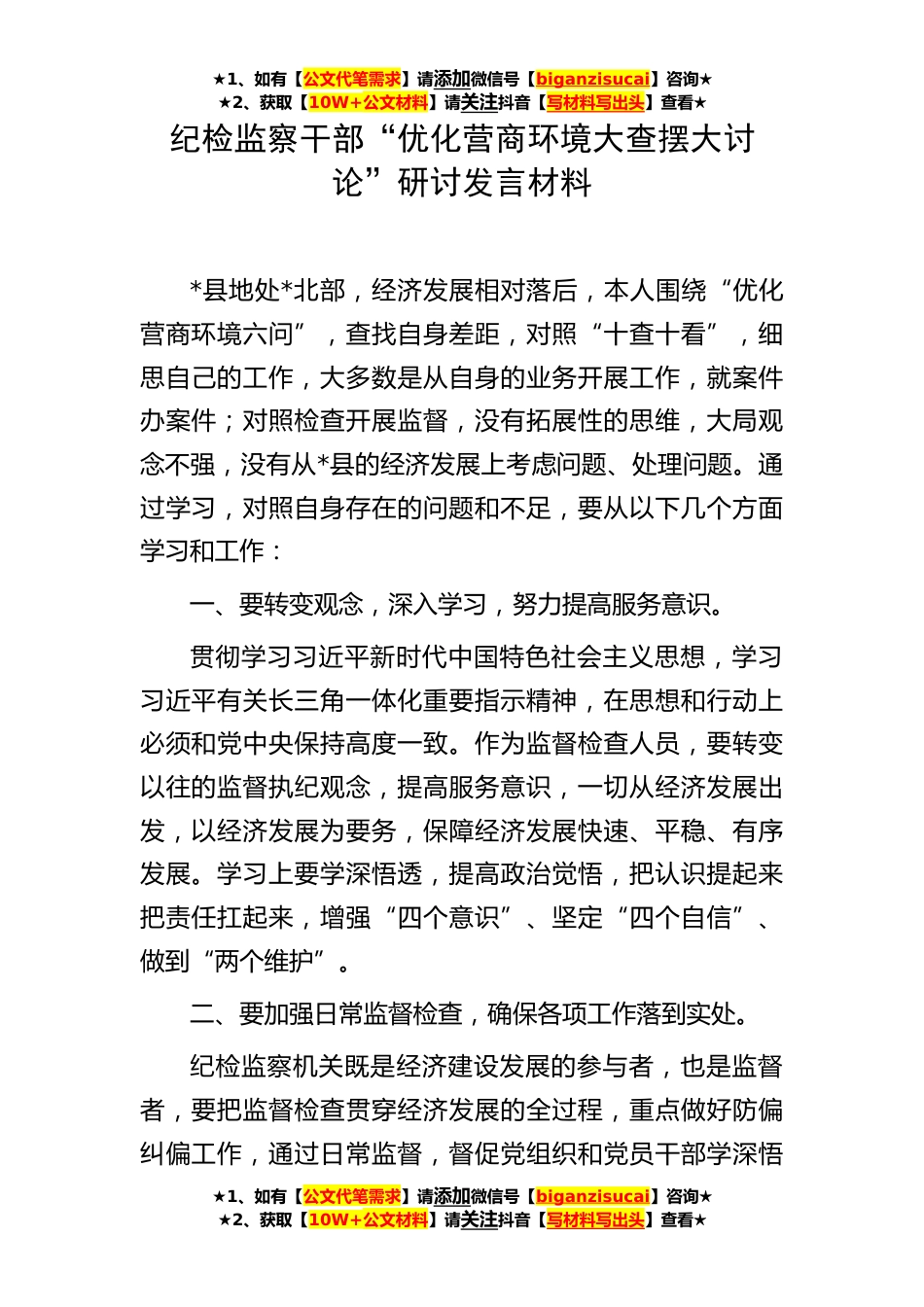 ★1、如有【公文代笔需求】请添加微信号【biganzisucai】咨询★★2、获取【10W+公文材料】请关注抖音【写材料写出头】查看★★1、如有【公文代笔需求】请添加微信号【biganzisucai】咨询★★2、获取【10W+公文材料】请关注抖音【写材料写出头】查看★★1、如有【公文代笔需求】请添加微信号【biganzisucai】咨询★★2、获取【10W+公文材料】请关注抖音【写材料写出头】查看★纪检监察干部“优化营商环境大查摆大讨论”研讨发言材料*县地处*北部,经济发展相对落后,本人围绕“优化营商环境六问”,查找自身差距,对照“十查十看”,细思自己的工作,大多数是从自身的业务开展工作,就案件办案件;对照检查开展监督,没有拓展性的思维,大局观念不强,没有从*县的经济发展上考虑问题、处理问题。通过学习,对照自身...