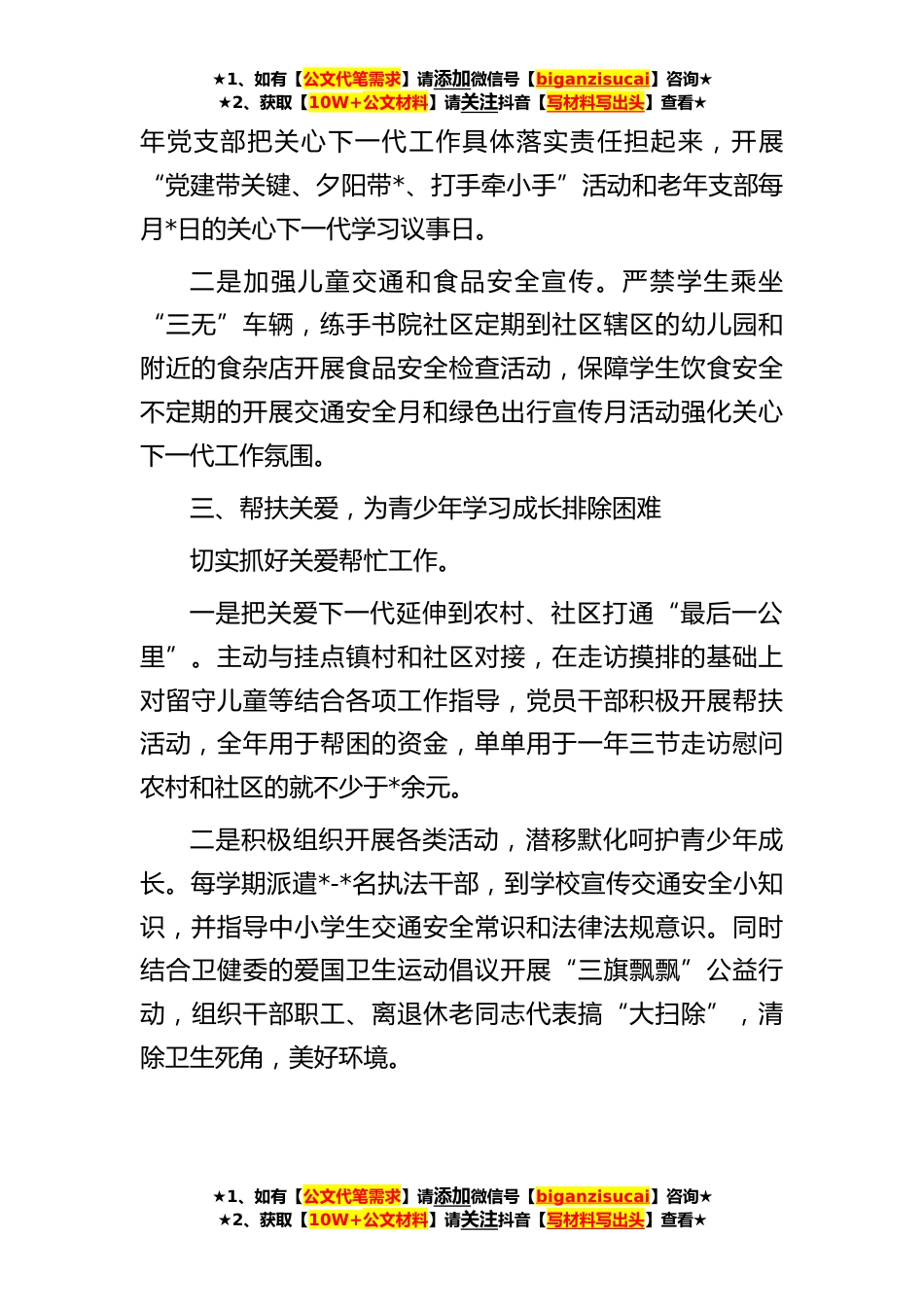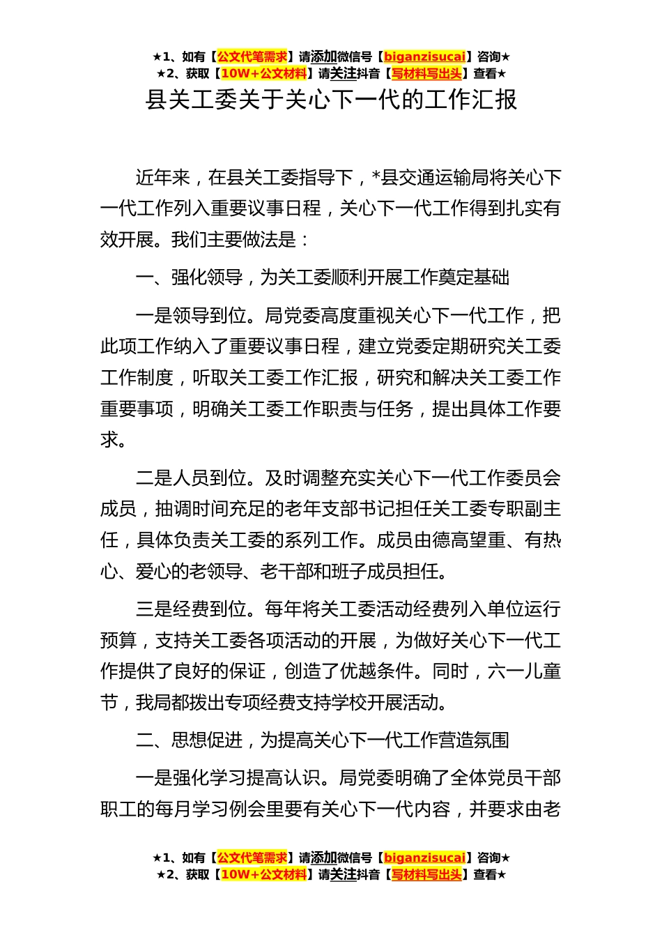 ★1、如有【公文代笔需求】请添加微信号【biganzisucai】咨询★★2、获取【10W+公文材料】请关注抖音【写材料写出头】查看★县关工委关于关心下一代的工作汇报近年来,在县关工委指导下,*县交通运输局将关心下一代工作列入重要议事日程,关心下一代工作得到扎实有效开展。我们主要做法是:一、强化领导,为关工委顺利开展工作奠定基础一是领导到位。局党委高度重视关心下一代工作,把此项工作纳入了重要议事日程,建立党委定期研究关工委工作制度,听取关工委工作汇报,研究和解决关工委工作重要事项,明确关工委工作职责与任务,提出具体工作要求。二是人员到位。及时调整充实关心下一代工作委员会成员,抽调时间充足的老年支部书记担任关工委专职副主任,具体负责关工委的系列工作。成员由德高望重、有热心、爱...