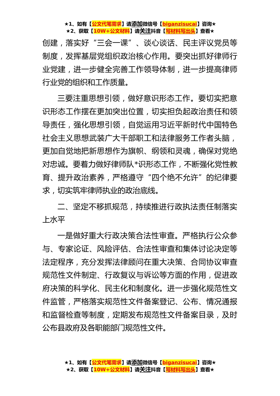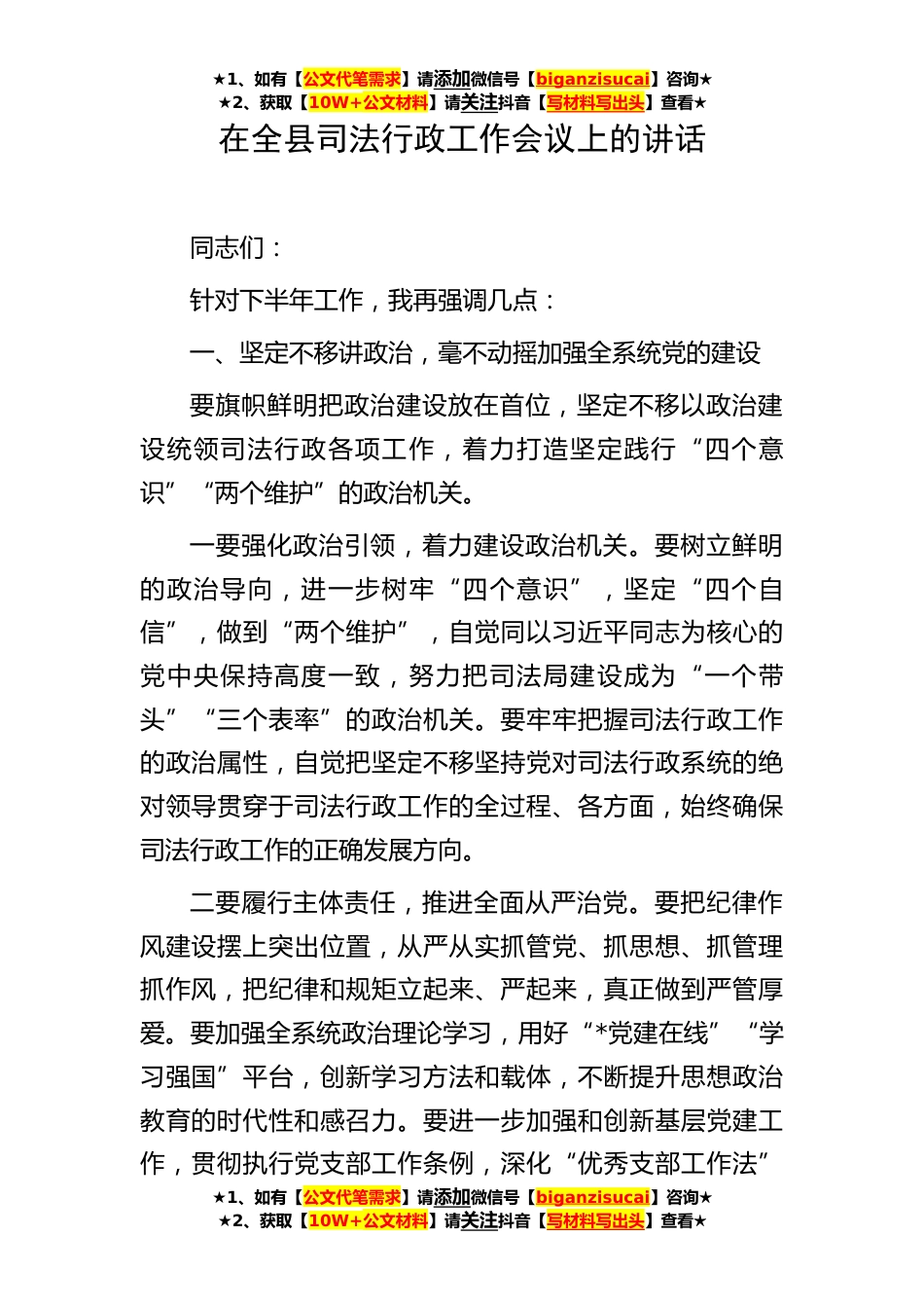 ★1、如有【公文代笔需求】请添加微信号【biganzisucai】咨询★★2、获取【10W+公文材料】请关注抖音【写材料写出头】查看★在全县司法行政工作会议上的讲话同志们:针对下半年工作,我再强调几点:一、坚定不移讲政治,毫不动摇加强全系统党的建设要旗帜鲜明把政治建设放在首位,坚定不移以政治建设统领司法行政各项工作,着力打造坚定践行“四个意识”“两个维护”的政治机关。一要强化政治引领,着力建设政治机关。要树立鲜明的政治导向,进一步树牢“四个意识”,坚定“四个自信”,做到“两个维护”,自觉同以习近平同志为核心的党中央保持高度一致,努力把司法局建设成为“一个带头”“三个表率”的政治机关。要牢牢把握司法行政工作的政治属性,自觉把坚定不移坚持党对司法行政系统的绝对领导贯穿于司法行...