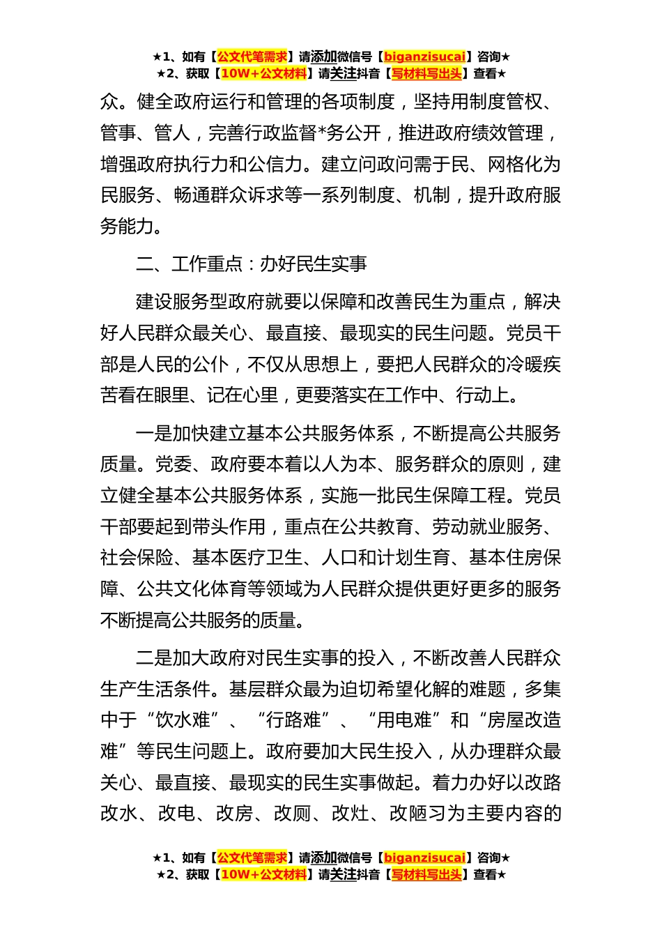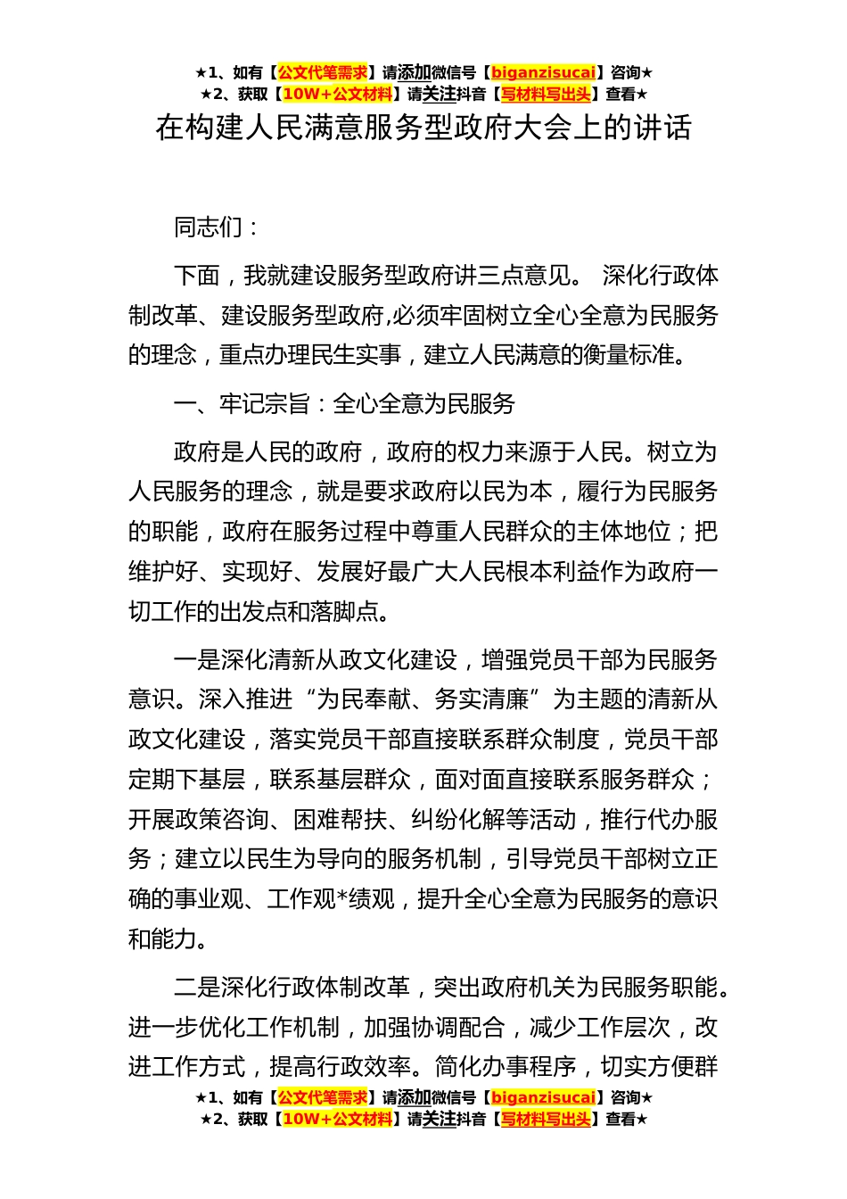 ★1、如有【公文代笔需求】请添加微信号【biganzisucai】咨询★★2、获取【10W+公文材料】请关注抖音【写材料写出头】查看★在构建人民满意服务型政府大会上的讲话同志们:下面,我就建设服务型政府讲三点意见。深化行政体制改革、建设服务型政府,必须牢固树立全心全意为民服务的理念,重点办理民生实事,建立人民满意的衡量标准。一、牢记宗旨:全心全意为民服务政府是人民的政府,政府的权力来源于人民。树立为人民服务的理念,就是要求政府以民为本,履行为民服务的职能,政府在服务过程中尊重人民群众的主体地位;把维护好、实现好、发展好最广大人民根本利益作为政府一切工作的出发点和落脚点。一是深化清新从政文化建设,增强党员干部为民服务意识。深入推进“为民奉献、务实清廉”为主题的清新从政文化建设...