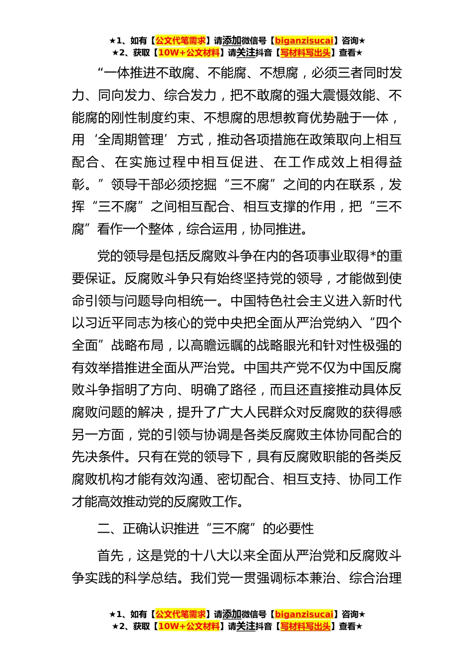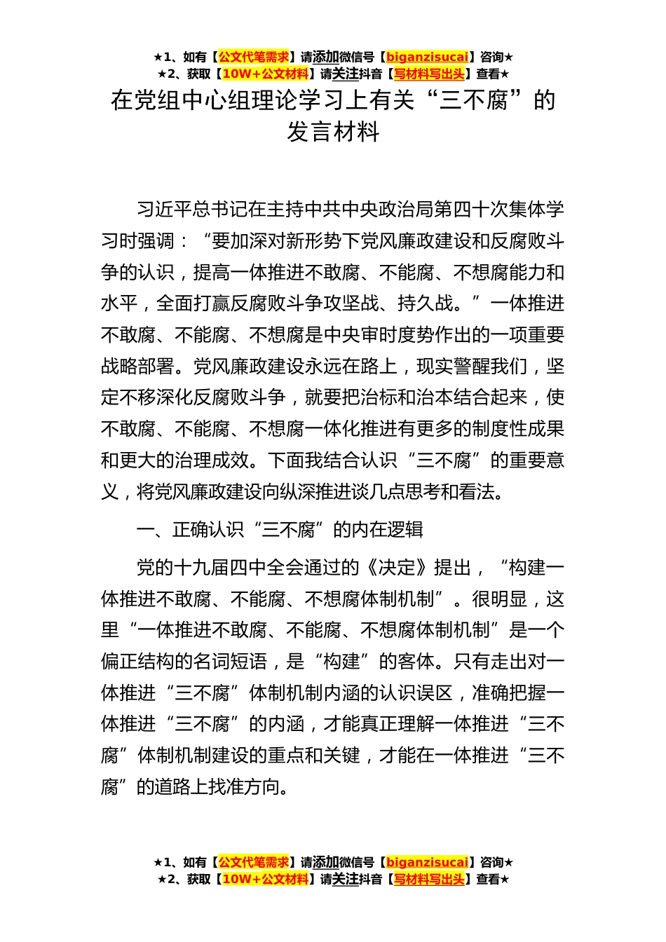 ★1、如有【公文代笔需求】请添加微信号【biganzisucai】咨询★★2、获取【10W+公文材料】请关注抖音【写材料写出头】查看★在党组中心组理论学习上有关“三不腐”的发言材料习近平总书记在主持中共中央政治局第四十次集体学习时强调:“要加深对新形势下党风廉政建设和反腐败斗争的认识,提高一体推进不敢腐、不能腐、不想腐能力和水平,全面打赢反腐败斗争攻坚战、持久战。”一体推进不敢腐、不能腐、不想腐是中央审时度势作出的一项重要战略部署。党风廉政建设永远在路上,现实警醒我们,坚定不移深化反腐败斗争,就要把治标和治本结合起来,使不敢腐、不能腐、不想腐一体化推进有更多的制度性成果和更大的治理成效。下面我结合认识“三不腐”的重要意义,将党风廉政建设向纵深推进谈几点思考和看法。一、正确...