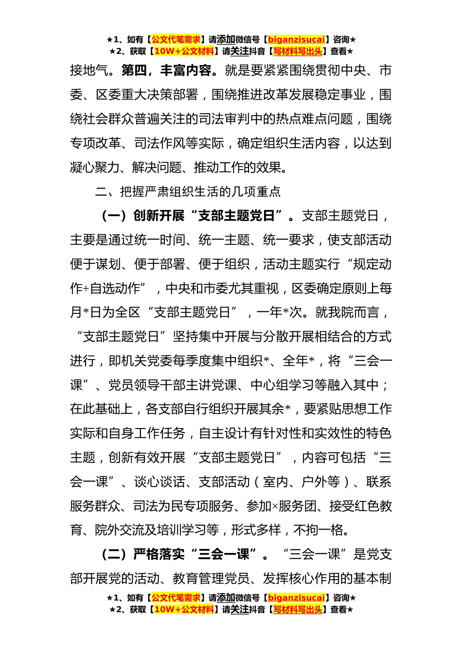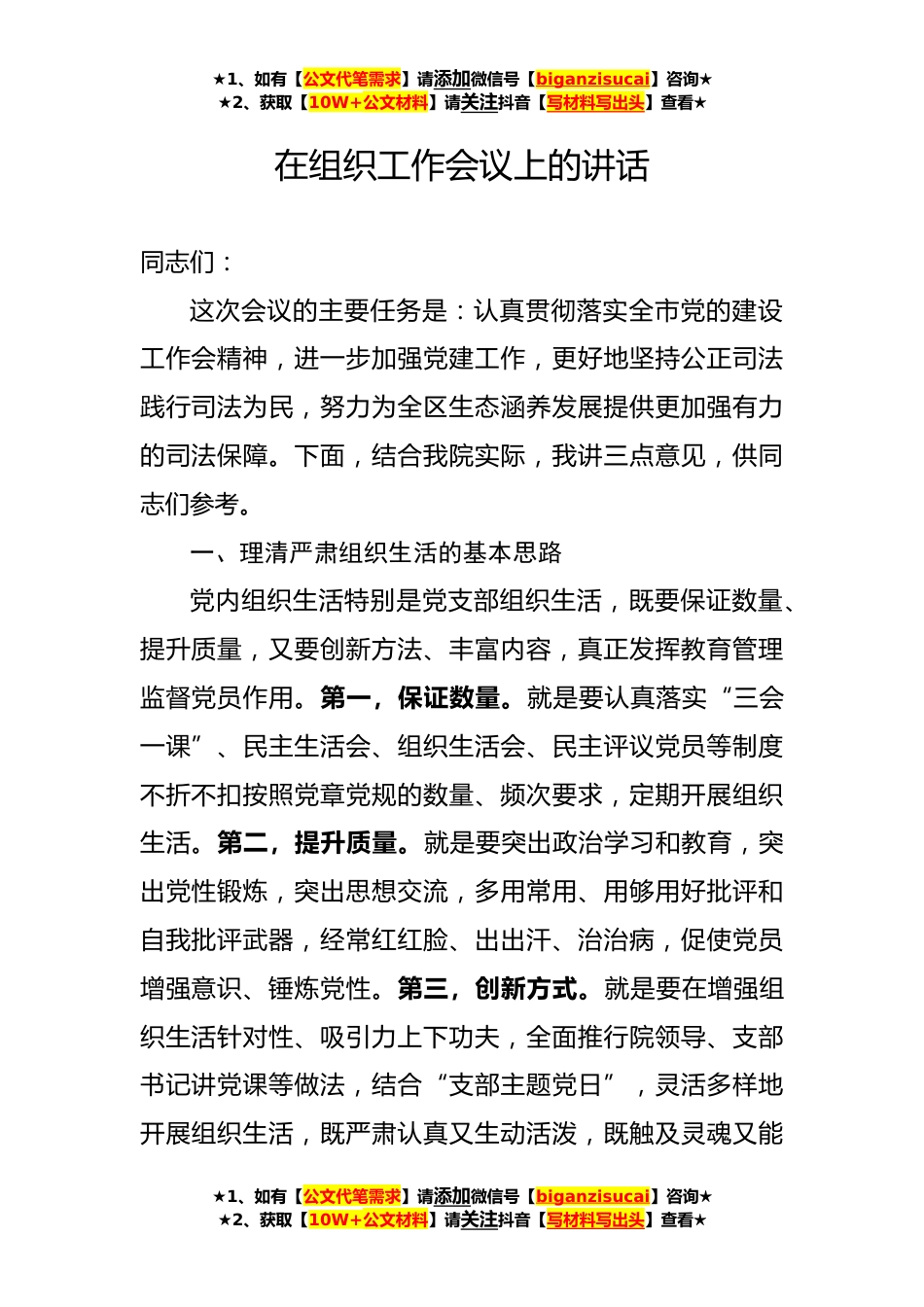★1、如有【公文代笔需求】请添加微信号【biganzisucai】咨询★★2、获取【10W+公文材料】请关注抖音【写材料写出头】查看★在组织工作会议上的讲话同志们:这次会议的主要任务是:认真贯彻落实全市党的建设工作会精神,进一步加强党建工作,更好地坚持公正司法践行司法为民,努力为全区生态涵养发展提供更加强有力的司法保障。下面,结合我院实际,我讲三点意见,供同志们参考。一、理清严肃组织生活的基本思路党内组织生活特别是党支部组织生活,既要保证数量、提升质量,又要创新方法、丰富内容,真正发挥教育管理监督党员作用。第一,保证数量。就是要认真落实“三会一课”、民主生活会、组织生活会、民主评议党员等制度不折不扣按照党章党规的数量、频次要求,定期开展组织生活。第二,提升质量。就是要突出...