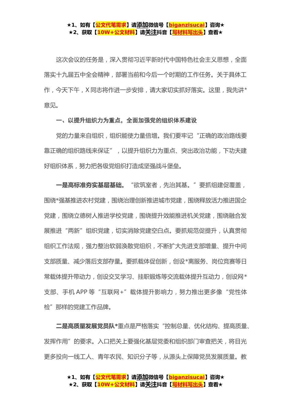 ★1、如有【公文代笔需求】请添加微信号【biganzisucai】咨询★★2、获取【10W+公文材料】请关注抖音【写材料写出头】查看★这次会议的任务是,深入贯彻习近平新时代中国特色社会主义思想,全面落实十九届五中全会精神,部署当前和今后一个时期的工作任务。关于具体工作,今天下午,X同志将作进一步安排,请大家切实抓好落实。这里,我先讲*意见。一、以提升组织力为重点,全面加强党的组织体系建设党的力量来自组织,组织能使力量倍增。我们要牢记“正确的政治路线要靠正确的组织路线来保证”,以提升组织力为重点、突出政治功能,下功夫建好组织体系,努力把各级党组织打造成坚强战斗堡垒。一是高标准夯实基层基础。“欲筑室者,先治其基。”要抓组建促覆盖,围绕*强基推进农村党建,围绕治理创新推进城市党建,...
