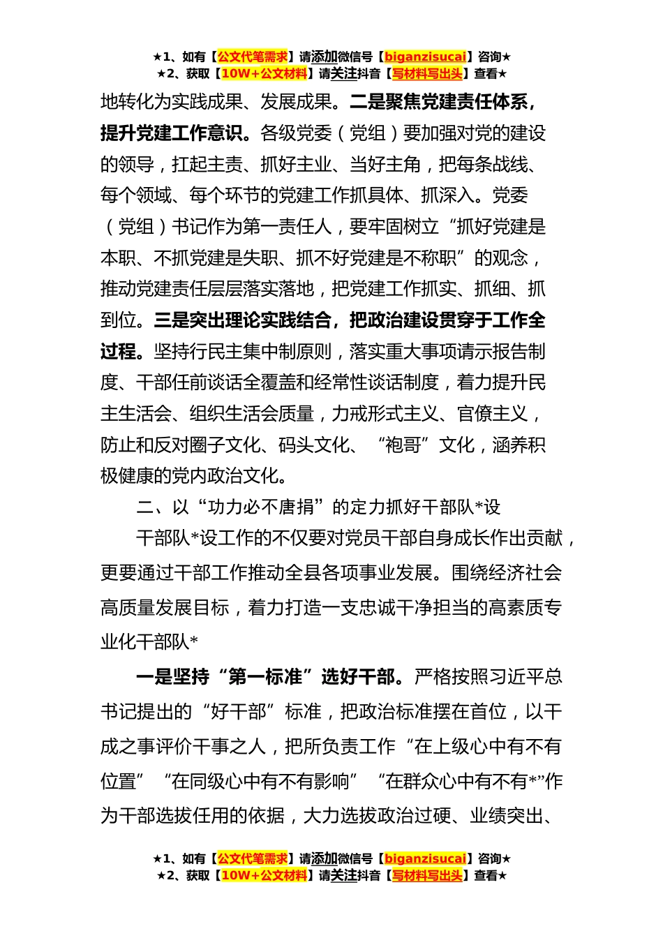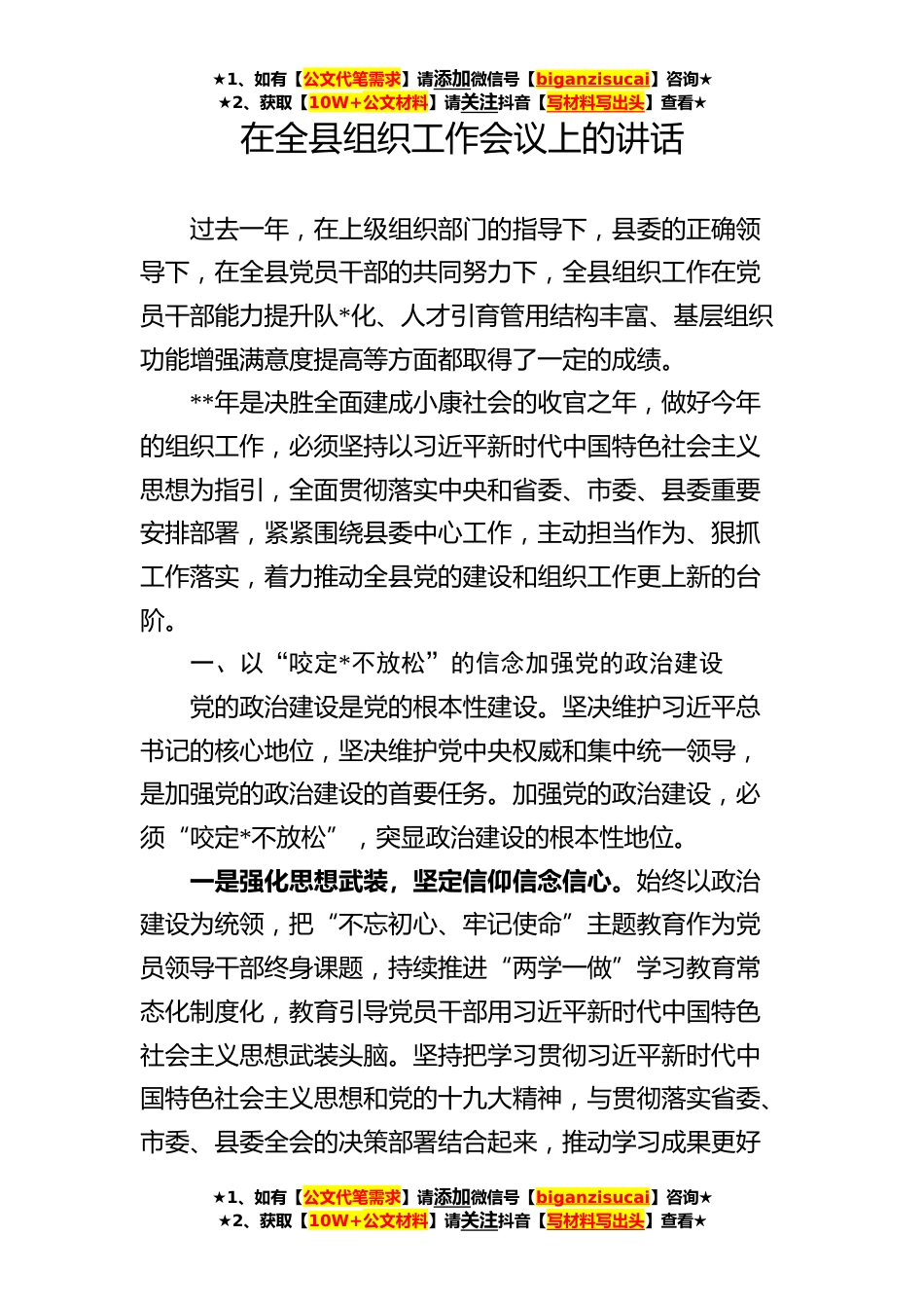 ★1、如有【公文代笔需求】请添加微信号【biganzisucai】咨询★★2、获取【10W+公文材料】请关注抖音【写材料写出头】查看★在全县组织工作会议上的讲话过去一年,在上级组织部门的指导下,县委的正确领导下,在全县党员干部的共同努力下,全县组织工作在党员干部能力提升队*化、人才引育管用结构丰富、基层组织功能增强满意度提高等方面都取得了一定的成绩。**年是决胜全面建成小康社会的收官之年,做好今年的组织工作,必须坚持以习近平新时代中国特色社会主义思想为指引,全面贯彻落实中央和省委、市委、县委重要安排部署,紧紧围绕县委中心工作,主动担当作为、狠抓工作落实,着力推动全县党的建设和组织工作更上新的台阶。一、以“咬定*不放松”的信念加强党的政治建设党的政治建设是党的根本性建设。坚决维...