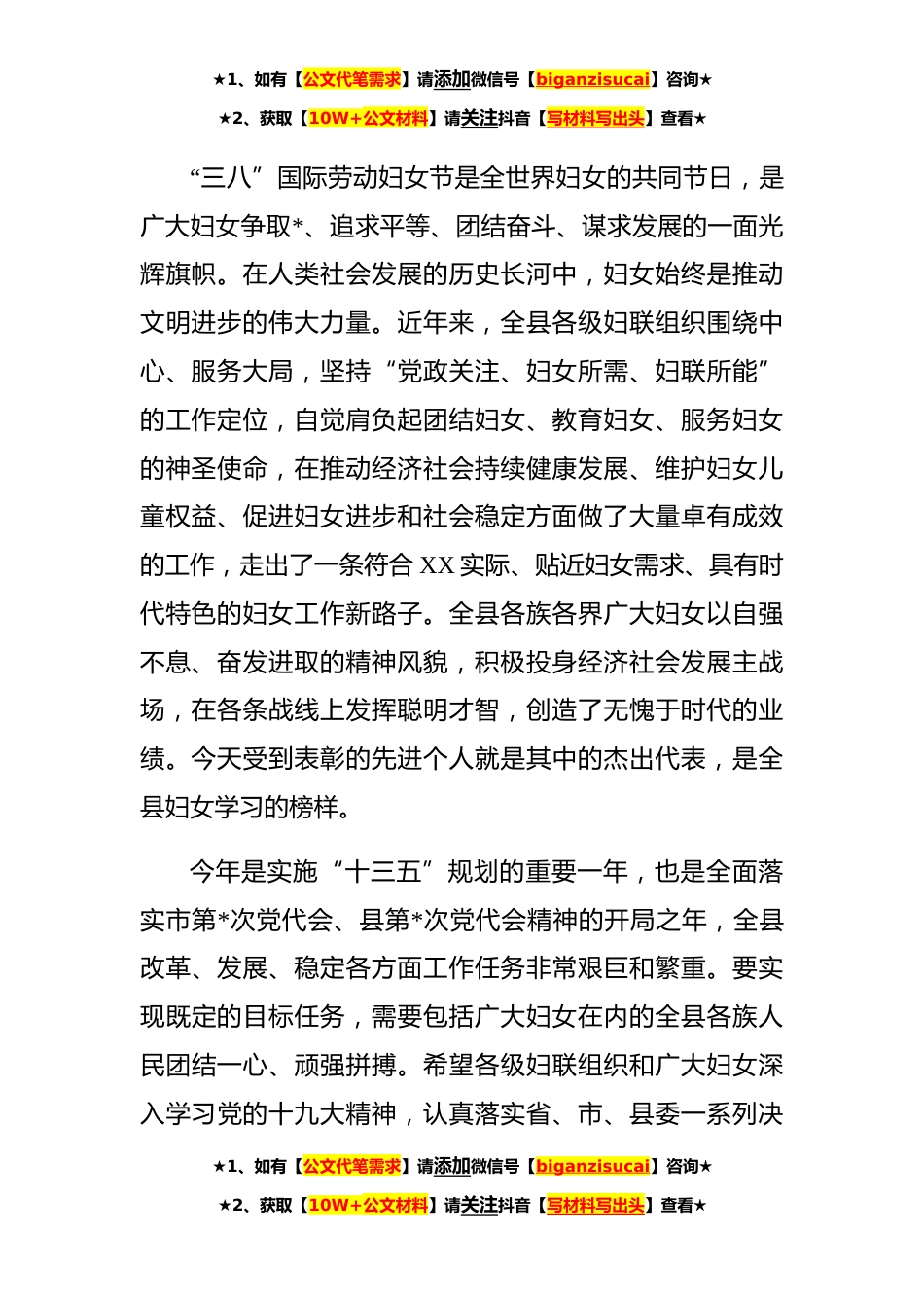 ★1、如有【公文代笔需求】请添加微信号【biganzisucai】咨询★★2、获取【10W+公文材料】请关注抖音【写材料写出头】查看★在XX县“三八”国际劳动妇女节纪念表彰大会上的讲话中共XX县委副书记XXX(**年**)广大妇女同胞们,各位领导、同志们:今天,我们在这里隆重集会,共同庆祝第**“三八”国际劳动妇女节,表彰奖励全县“三八*手”、“巾帼建功标兵”、“最美家庭”等先进典型,对于激励全县广大妇女继承优良传统、弘扬时代精神,在“五个XX”建设中再立新功、再创佳绩,具有非常重要的意义。首先,我代表县委、人大、政府、政协,向全县妇女同胞们和妇女工作者致以节日的问候!向受到表彰奖励的先进集体、先进个人表示热烈的祝贺!向所有关心支持我县妇女事业发展的各级领导和各界人士表示衷心的感谢!★1、...