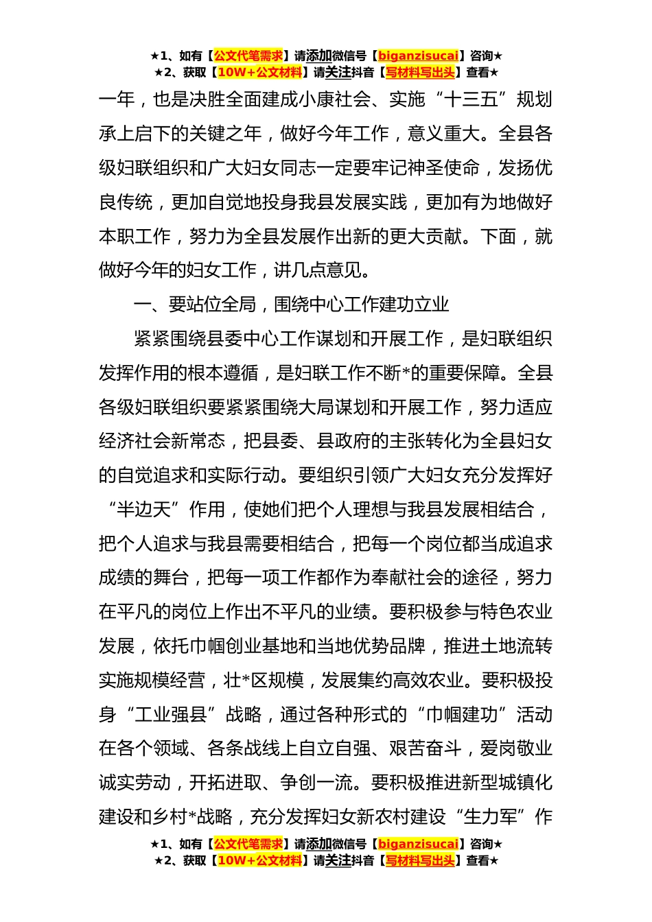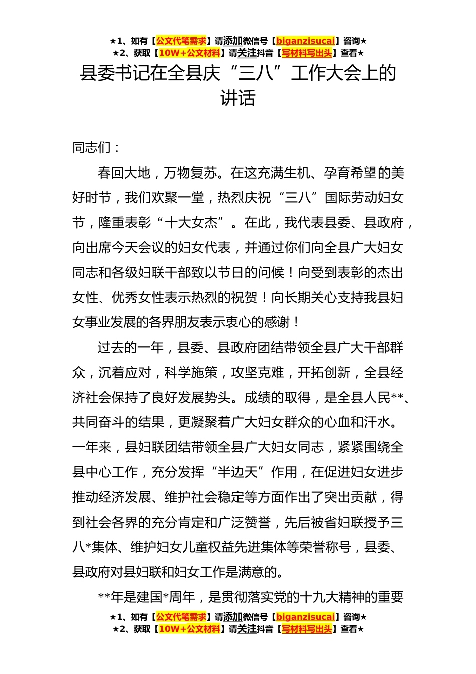 ★1、如有【公文代笔需求】请添加微信号【biganzisucai】咨询★★2、获取【10W+公文材料】请关注抖音【写材料写出头】查看★县委书记在全县庆“三八”工作大会上的讲话同志们:春回大地,万物复苏。在这充满生机、孕育希望的美好时节,我们欢聚一堂,热烈庆祝“三八”国际劳动妇女节,隆重表彰“十大女杰”。在此,我代表县委、县政府,向出席今天会议的妇女代表,并通过你们向全县广大妇女同志和各级妇联干部致以节日的问候!向受到表彰的杰出女性、优秀女性表示热烈的祝贺!向长期关心支持我县妇女事业发展的各界朋友表示衷心的感谢!过去的一年,县委、县政府团结带领全县广大干部群众,沉着应对,科学施策,攻坚克难,开拓创新,全县经济社会保持了良好发展势头。成绩的取得,是全县人民**、共同奋斗的结果,...