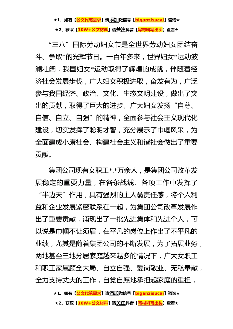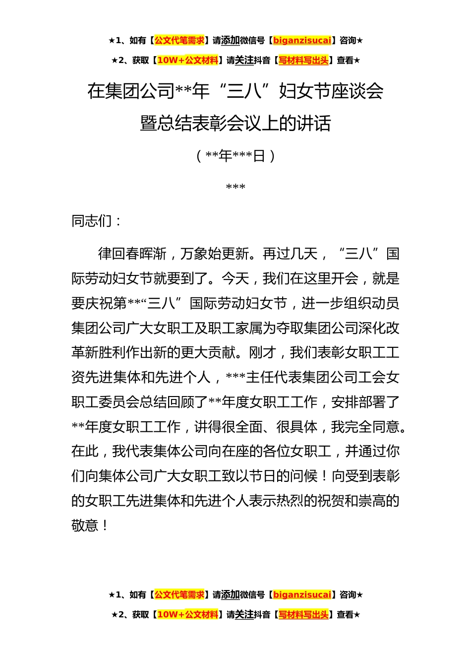 ★1、如有【公文代笔需求】请添加微信号【biganzisucai】咨询★★2、获取【10W+公文材料】请关注抖音【写材料写出头】查看★在集团公司**年“三八”妇女节座谈会暨总结表彰会议上的讲话(**年***日)***同志们:律回春晖渐,万象始更新。再过几天,“三八”国际劳动妇女节就要到了。今天,我们在这里开会,就是要庆祝第**“三八”国际劳动妇女节,进一步组织动员集团公司广大女职工及职工家属为夺取集团公司深化改革新胜利作出新的更大贡献。刚才,我们表彰女职工工资先进集体和先进个人,***主任代表集团公司工会女职工委员会总结回顾了**年度女职工工作,安排部署了**年度女职工工作,讲得很全面、很具体,我完全同意。在此,我代表集体公司向在座的各位女职工,并通过你们向集体公司广大女职工致以节日的问候!...