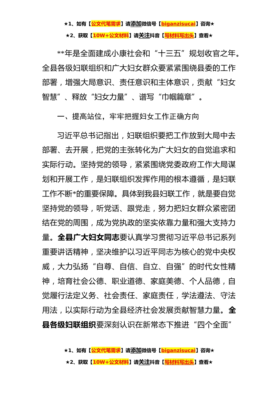 ★1、如有【公文代笔需求】请添加微信号【biganzisucai】咨询★★2、获取【10W+公文材料】请关注抖音【写材料写出头】查看★在庆“三八”暨妇女工作会议上的讲话同志们:在全国上下众志成城抗击疫情的日子里,我们在这里共同庆祝“三八”国际劳动妇女节,表彰过去一年为我县经济社会发展作出重要贡献的妇女工作先进集体和先进个人。在此,我谨代表县委向在座各位妇女并通过你们向全县妇女同胞致以节日的问候!向受到表彰的先进集体和个人表示热烈的祝贺!向一直以来关心支持妇女事业发展的社会各界人士,表示衷心的感谢!**年,是全县经济社会发展倍受考验的一年,全县各级妇联组织坚持服务大局、服务妇女、服务基层,用心帮助妇女儿童排忧解难,用情维护妇女儿童合法权益,用力推进基层妇女组织改革,用智促进城...