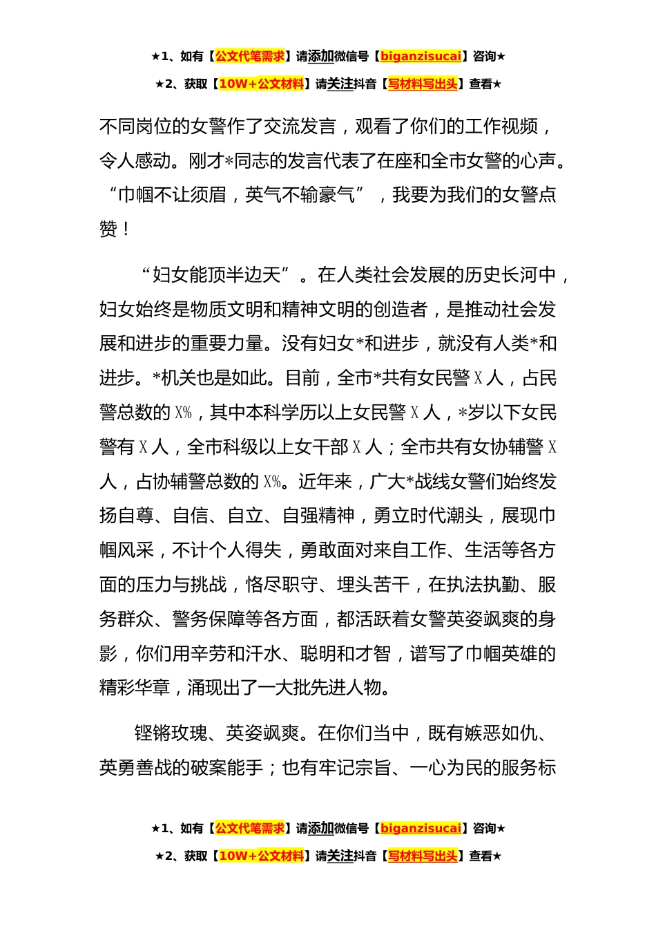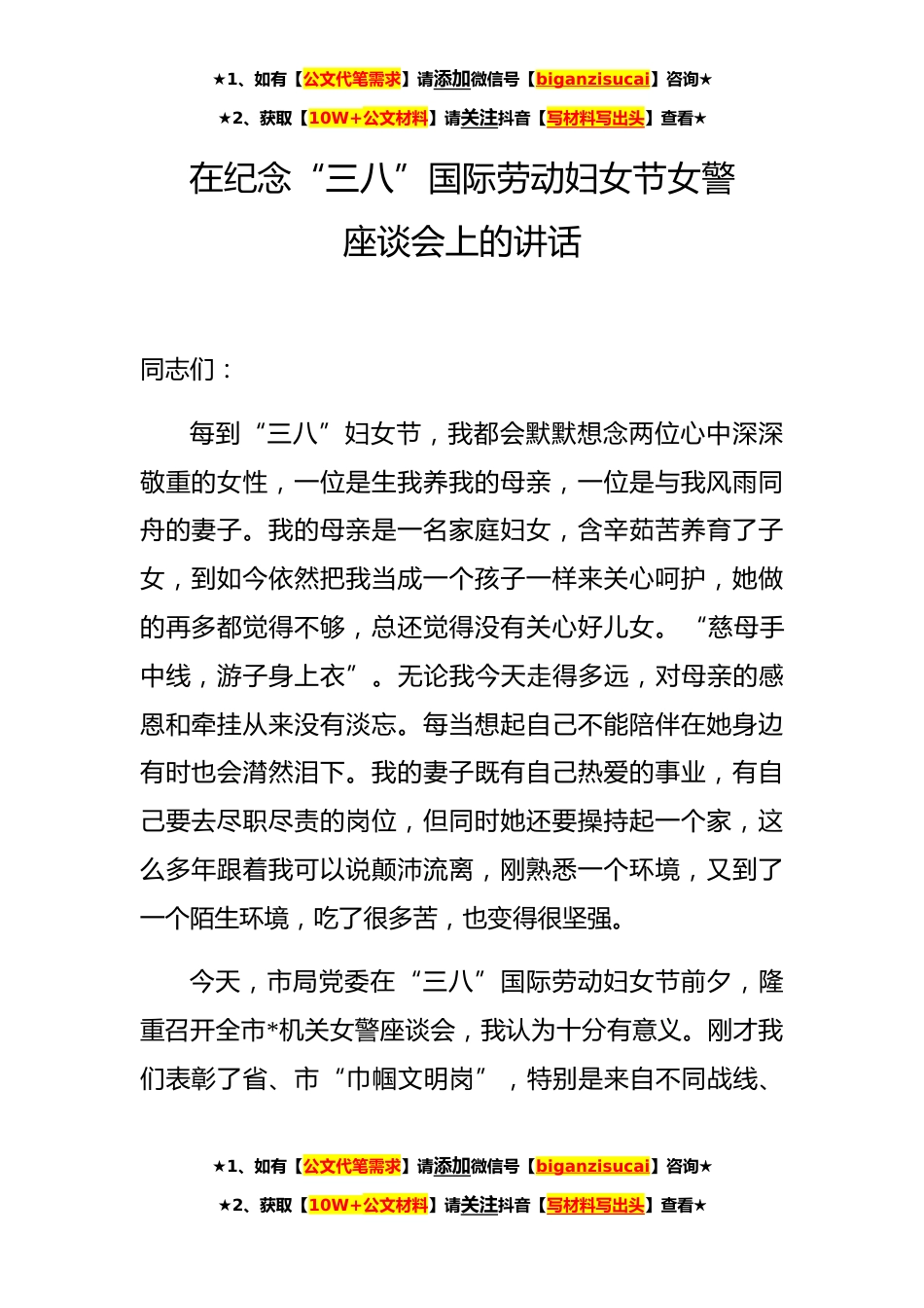 ★1、如有【公文代笔需求】请添加微信号【biganzisucai】咨询★★2、获取【10W+公文材料】请关注抖音【写材料写出头】查看★在纪念“三八”国际劳动妇女节女警座谈会上的讲话同志们:每到“三八”妇女节,我都会默默想念两位心中深深敬重的女性,一位是生我养我的母亲,一位是与我风雨同舟的妻子。我的母亲是一名家庭妇女,含辛茹苦养育了子女,到如今依然把我当成一个孩子一样来关心呵护,她做的再多都觉得不够,总还觉得没有关心好儿女。“慈母手中线,游子身上衣”。无论我今天走得多远,对母亲的感恩和牵挂从来没有淡忘。每当想起自己不能陪伴在她身边有时也会潸然泪下。我的妻子既有自己热爱的事业,有自己要去尽职尽责的岗位,但同时她还要操持起一个家,这么多年跟着我可以说颠沛流离,刚熟悉一个环境,又...