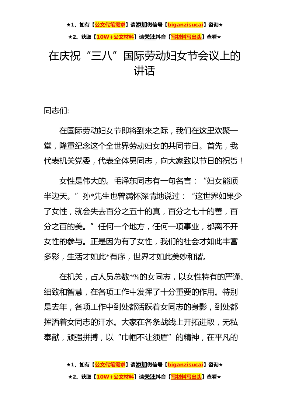 ★1、如有【公文代笔需求】请添加微信号【biganzisucai】咨询★★2、获取【10W+公文材料】请关注抖音【写材料写出头】查看★在庆祝“三八”国际劳动妇女节会议上的讲话同志们:在国际劳动妇女节即将到来之际,我们在这里欢聚一堂,隆重纪念这个全世界劳动妇女的共同节日。首先,我代表机关党委,代表全体男同志,向大家致以节日的祝贺!女性是伟大的。毛泽东同志有一句名言:“妇女能顶半边天。”孙*先生也曾满怀深情地说过:“这世界如果少了女性,就会失去百分之五十的真,百分之七十的善,百分之百的美。”任何一个地方,任何一项事业,都离不开女性的参与。正是因为有了女性,我们的社会才如此丰富多彩,生活才如此*有序,世界才如此美妙和谐。在机关,占人员总数*%的女同志,以女性特有的严谨、细致和智慧,在...