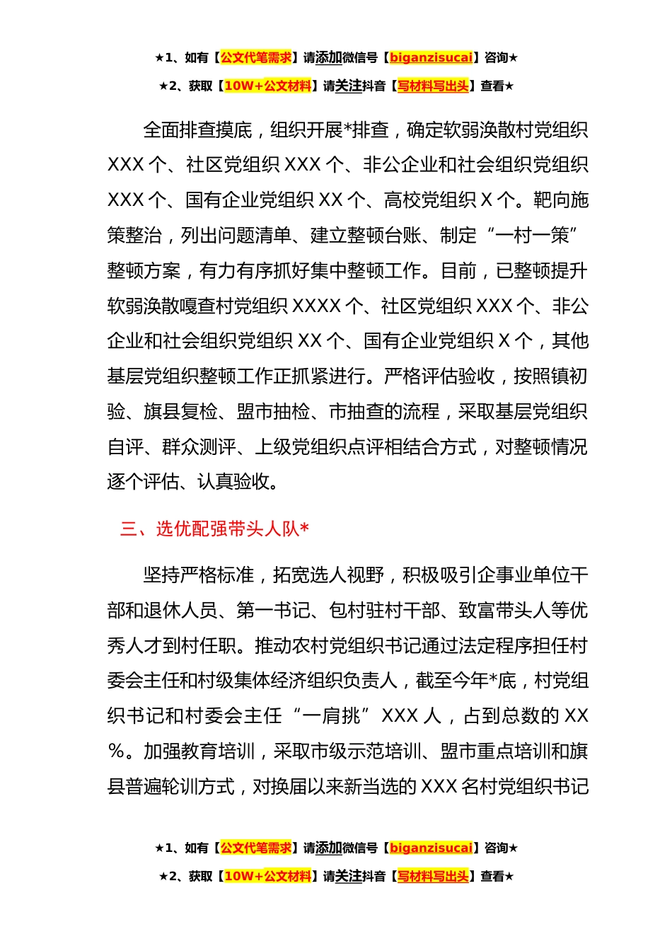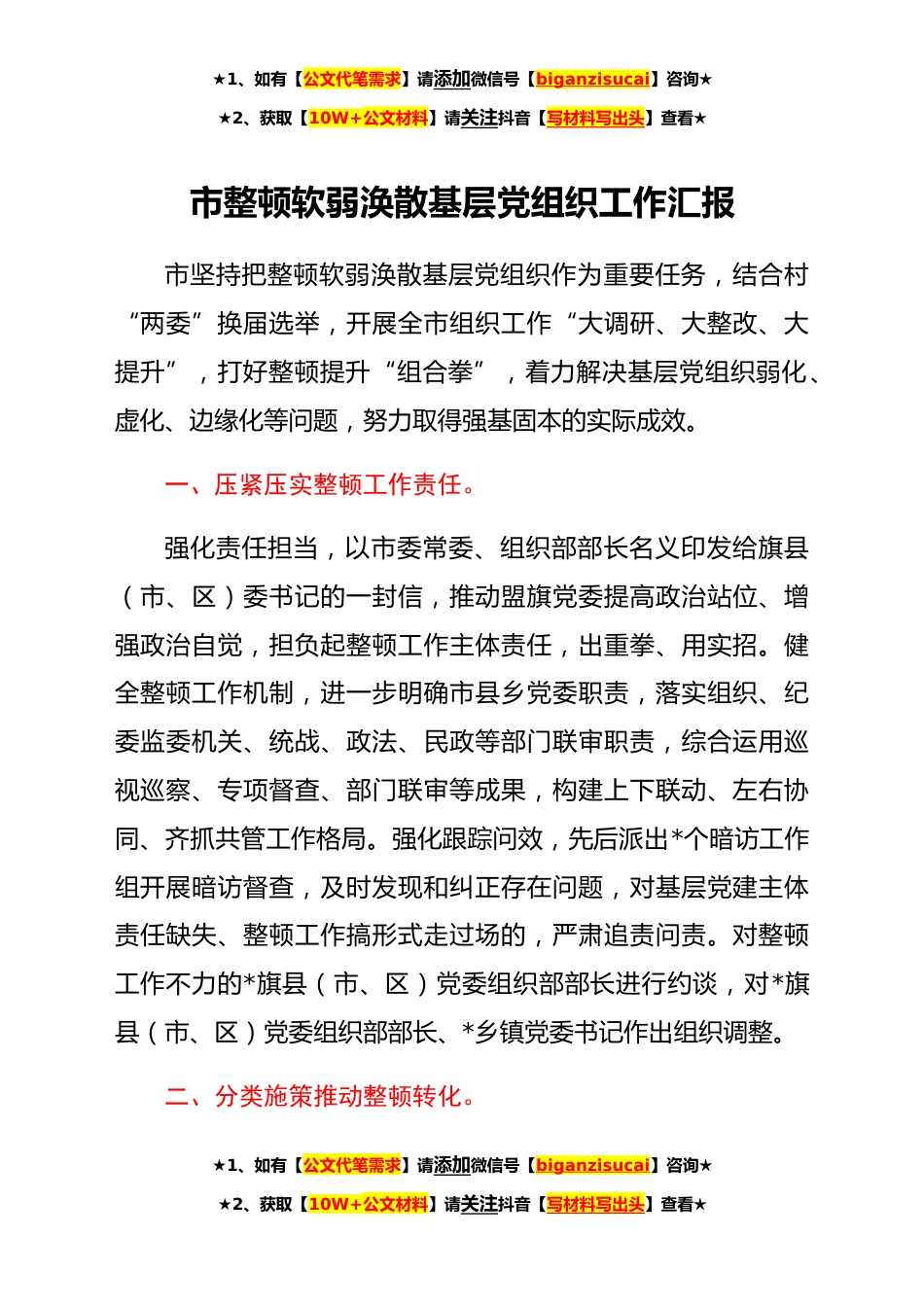 ★1、如有【公文代笔需求】请添加微信号【biganzisucai】咨询★★2、获取【10W+公文材料】请关注抖音【写材料写出头】查看★市整顿软弱涣散基层党组织工作汇报市坚持把整顿软弱涣散基层党组织作为重要任务,结合村“两委”换届选举,开展全市组织工作“大调研、大整改、大提升”,打好整顿提升“组合拳”,着力解决基层党组织弱化、虚化、边缘化等问题,努力取得强基固本的实际成效。一、压紧压实整顿工作责任。强化责任担当,以市委常委、组织部部长名义印发给旗县(市、区)委书记的一封信,推动盟旗党委提高政治站位、增强政治自觉,担负起整顿工作主体责任,出重拳、用实招。健全整顿工作机制,进一步明确市县乡党委职责,落实组织、纪委监委机关、统战、政法、民政等部门联审职责,综合运用巡视巡察、专项督...