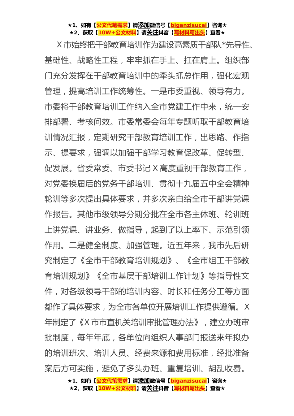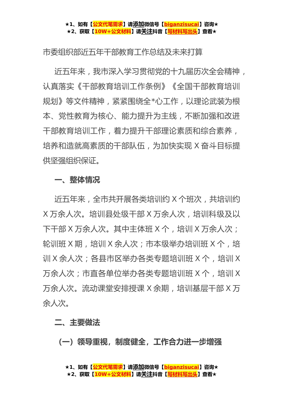 ★1、如有【公文代笔需求】请添加微信号【biganzisucai】咨询★★2、获取【10W+公文材料】请关注抖音【写材料写出头】查看★市委组织部近五年干部教育工作总结及未来打算近五年来,我市深入学习贯彻党的十九届历次全会精神,认真落实《干部教育培训工作条例》《全国干部教育培训规划》等文件精神,紧紧围绕全*心工作,以理论武装为根本、党性教育为核心、能力提升为主线,不断加强和改进干部教育培训工作,着力提升干部理论素质和综合素养,培养和造就高素质的干部队伍,为加快实现X奋斗目标提供坚强组织保证。一、整体情况近五年来,全市共开展各类培训约X个班次,共培训约X万余人次。培训县处级干部X万余人次,培训科级及以下干部X万余人次。其中主体班X个,培训X万余人次;轮训班X期,培训X余人次;市本级举办...