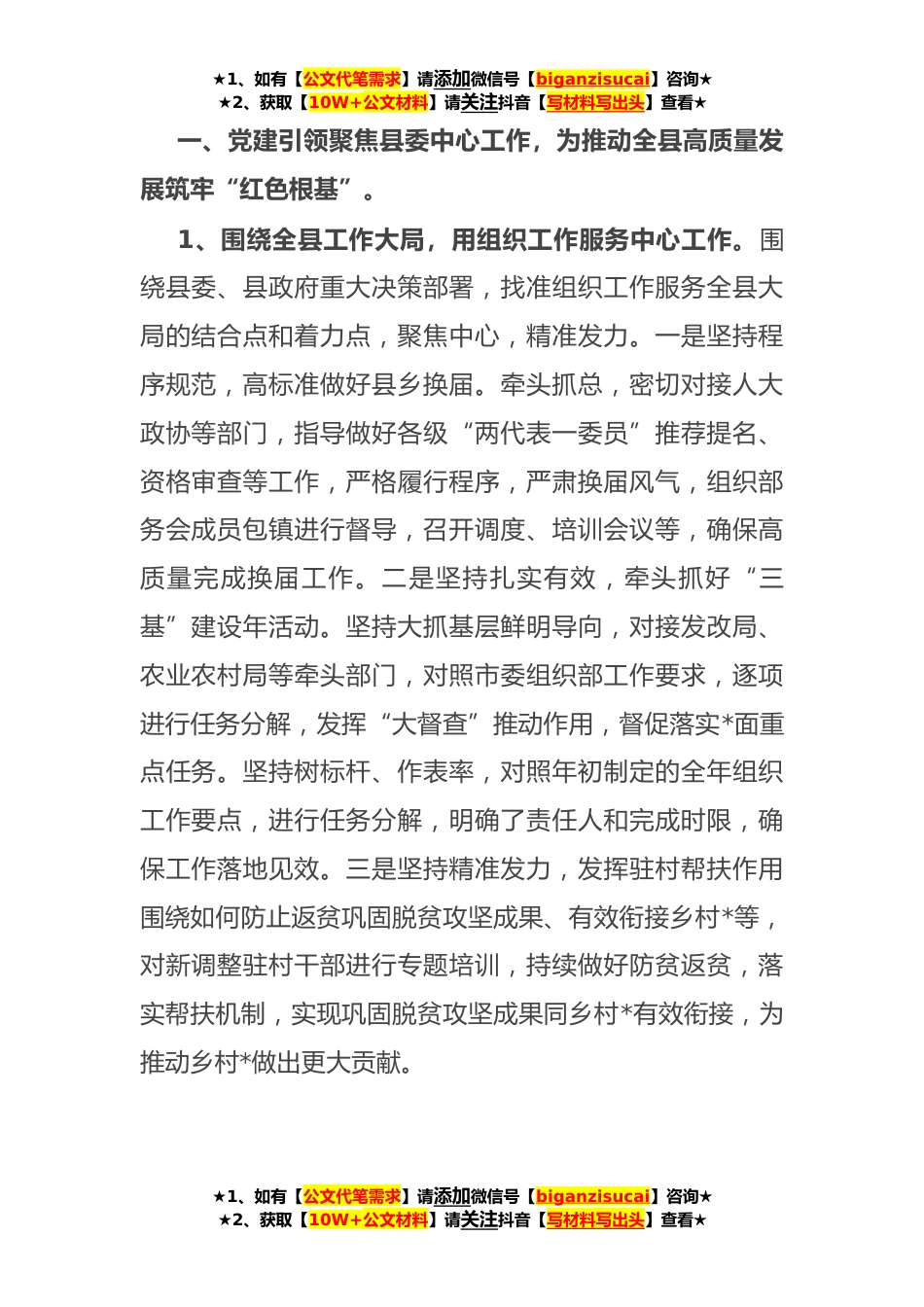 ★1、如有【公文代笔需求】请添加微信号【biganzisucai】咨询★★2、获取【10W+公文材料】请关注抖音【写材料写出头】查看★县委组织部**上半年工作总结暨下半年工作计划今年以来,面对“‘十四五’开局、庆祝建党**年、党史学习教育、县乡村换届”等大战大考,xx县委组织部凝心聚力,攻坚实干,较好地完成了各项任务。一是以抓牢抓实基层党建为重点,组织*个基层党(工)委召开年度党建工作述职会议,强化了“书记抓、抓书记”责任体系;圆满完成xx个村、xx个社区“两委”换届选举,书记主任全部实现“一人兼”,党组织书记队*构比例大幅改善;在“开门一件事”活动中为民办实事xx余件,树好了新班子新形象。二是以激励干部干事创业为导向,稳步推进乡镇换届,完成干部人事档案审核xx卷,调整干部xx名,班子结构...