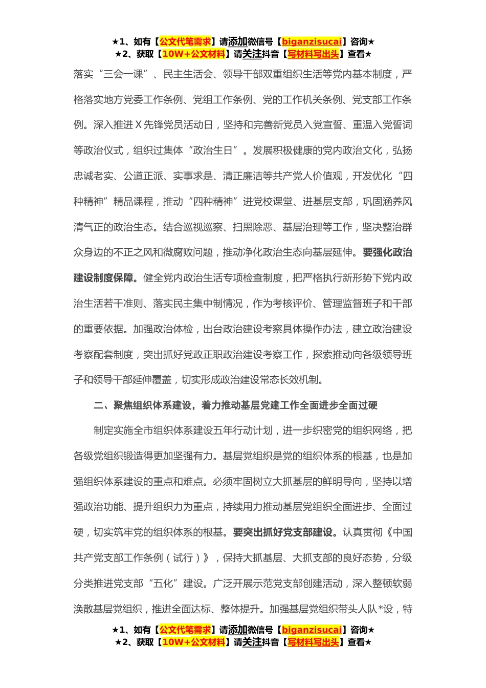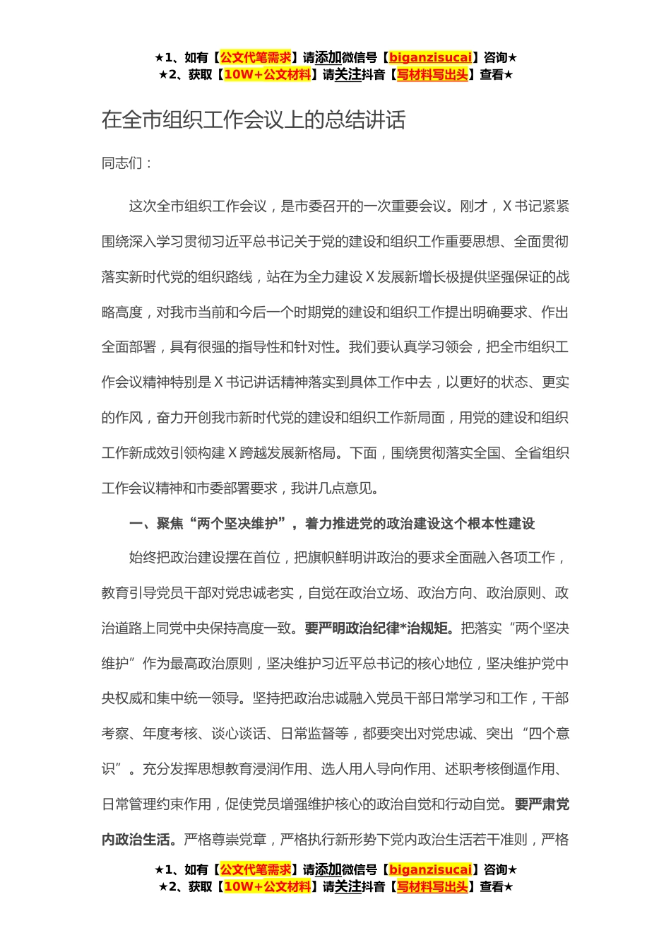 ★1、如有【公文代笔需求】请添加微信号【biganzisucai】咨询★★2、获取【10W+公文材料】请关注抖音【写材料写出头】查看★在全市组织工作会议上的总结讲话同志们:这次全市组织工作会议,是市委召开的一次重要会议。刚才,X书记紧紧围绕深入学习贯彻习近平总书记关于党的建设和组织工作重要思想、全面贯彻落实新时代党的组织路线,站在为全力建设X发展新增长极提供坚强保证的战略高度,对我市当前和今后一个时期党的建设和组织工作提出明确要求、作出全面部署,具有很强的指导性和针对性。我们要认真学习领会,把全市组织工作会议精神特别是X书记讲话精神落实到具体工作中去,以更好的状态、更实的作风,奋力开创我市新时代党的建设和组织工作新局面,用党的建设和组织工作新成效引领构建X跨越发展新格局。下面...