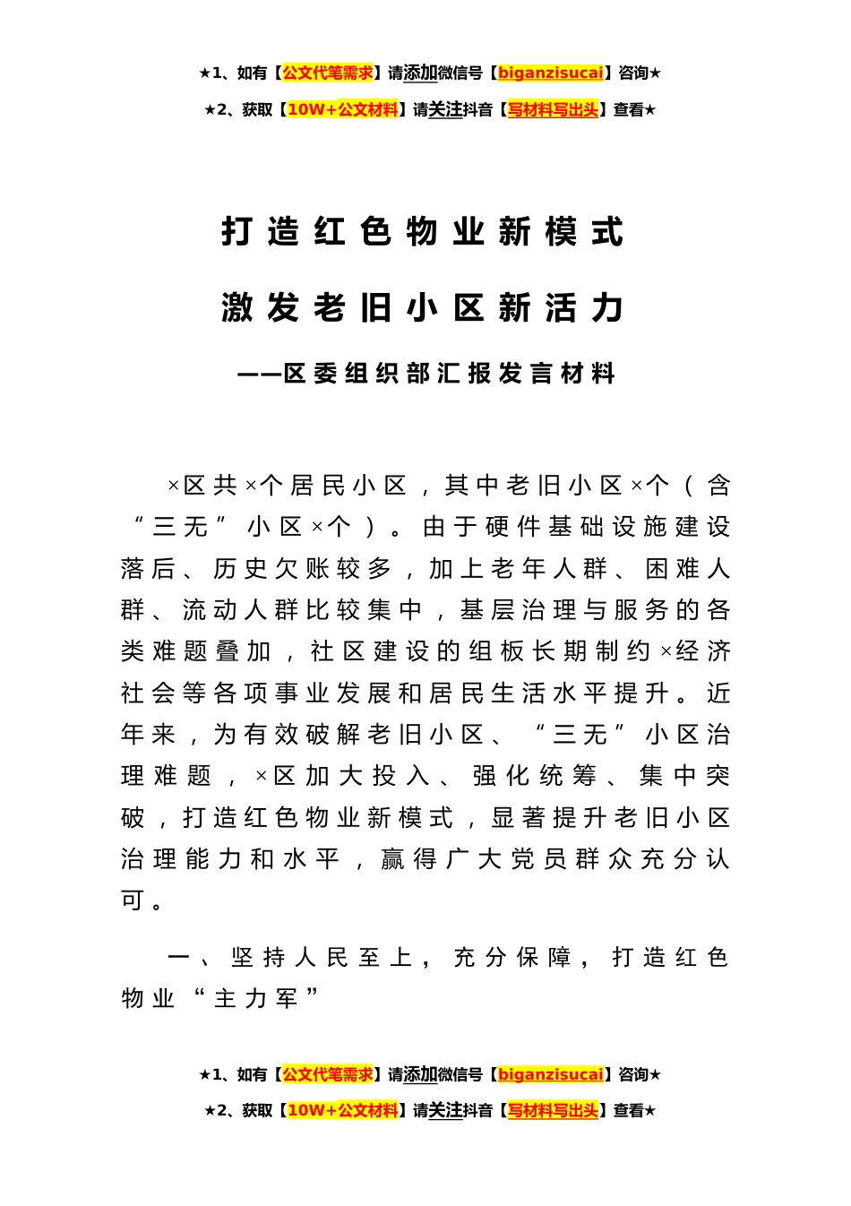 ★1、如有【公文代笔需求】请添加微信号【biganzisucai】咨询★★2、获取【10W+公文材料】请关注抖音【写材料写出头】查看★打造红色物业新模式激发老旧小区新活力——区委组织部汇报发言材料×区共×个居民小区,其中老旧小区×个(含“三无”小区×个)。由于硬件基础设施建设落后、历史欠账较多,加上老年人群、困难人群、流动人群比较集中,基层治理与服务的各类难题叠加,社区建设的组板长期制约×经济社会等各项事业发展和居民生活水平提升。近年来,为有效破解老旧小区、“三无”小区治理难题,×区加大投入、强化统筹、集中突破,打造红色物业新模式,显著提升老旧小区治理能力和水平,赢得广大党员群众充分认可。一、坚持人民至上,充分保障,打造红色物业“主力军”★1、如有【公文代笔需求】请添加微信...