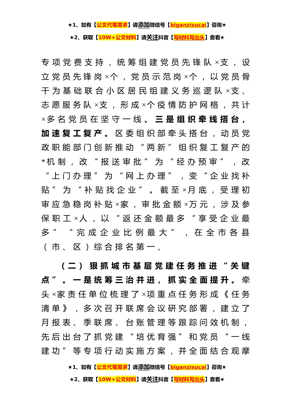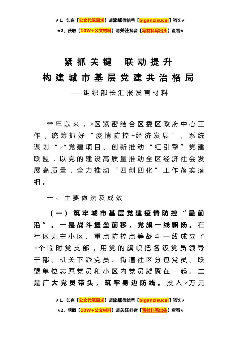 ★1、如有【公文代笔需求】请添加微信号【biganzisucai】咨询★★2、获取【10W+公文材料】请关注抖音【写材料写出头】查看★紧抓关键联动提升构建城市基层党建共治格局——组织部长汇报发言材料**年以来,×区紧密结合区委区政府中心工作,统筹抓好“疫情防控+经济发展”、系统谋划“×”党建项目、创新推动“红引擎”党建联盟,以党的建设高质量推动全区经济社会发展高质量,全力推动“四创四化”工作落实落细。一、主要做法及成效(一)筑牢城市基层党建疫情防控“最前沿”。一是战斗堡垒前移,党旗一线飘扬。在社区无主小区、重点防控点等战斗一线成立了×个临时党支部,用党的旗帜把各级党员领导干部、机关下派党员、街道社区分包党员、联盟单位志愿党员和小区内党员凝聚在一起。二是广大党员带头,筑牢身边防...